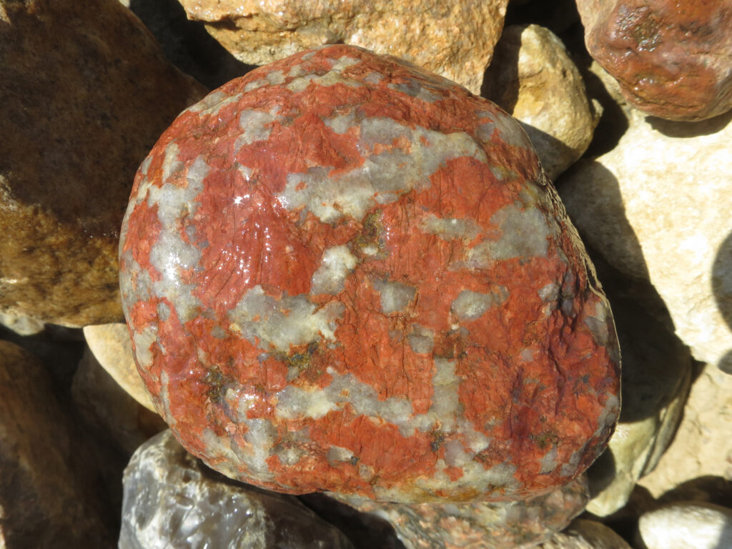 Der grobkörnige und leicht deformierte Alkalifeldspatgranit („Gneisgranit“) besitzt eine netzartige Textur aus rotem Alkalifeldspat sowie reichlich granuliertem Quarz in Form einer feinkörnigen und glitzernden („zuckerkörnigen“) Kristallmasse. Im Unterschied zum Quarz sind die Alkalifeldspäte weitgehend intakt und zeigen bei geeignetem Anschnitt nahezu rechteckige Umrisse. Auf der rauhen Bruchfläche des Gesteins lassen sich die Netztextur und der granulierte Quarz am besten beobachten. Die Alkalifeldspäte sind hier gleichmäßig leuchtend rot gefärbt. Dunkle Minerale sowie Plagioklas fehlen oder kommen nur in geringer Menge vor (Beschreibung in Hesemann 1939 und Zandstra 1988, 1999; s. a. skan-kristallin.de).