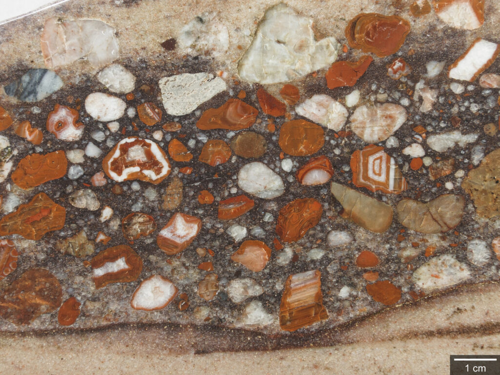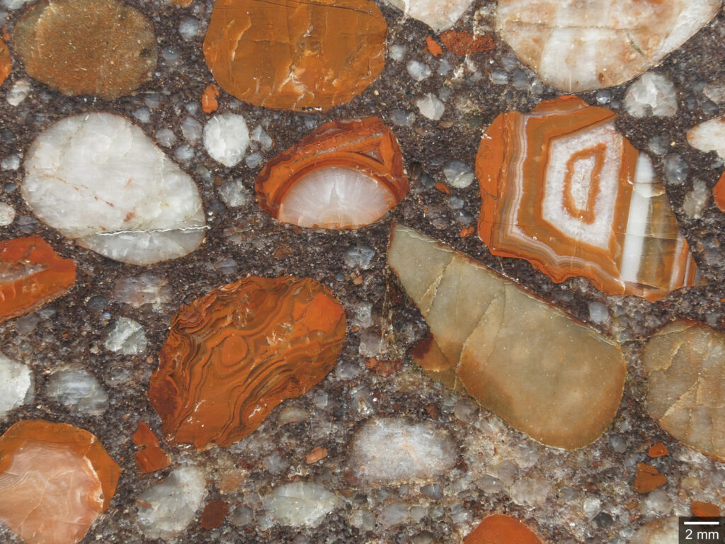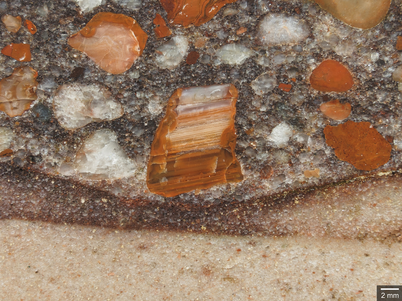 Der Ignimbrit von Idekulla (s. a. Abb. 1) besitzt eine hellbraune bis braune Grundmasse, die Fiamme ist dunkel- bis schwarzbraun. In der Mitte der Fiamme sind sekundäre Ausscheidungen von hellem Quarz erkennbar. Der Vulkanit enthält wenige weiße und mm-große Feldspat-Einsprenglinge, die überwiegend intakt sind und klare Begrenzungen zeigen. Quarz-Einsprenglinge kommen nicht vor.