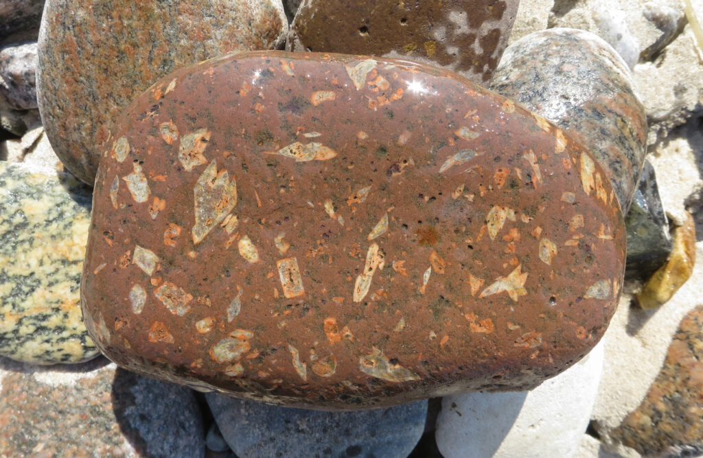 Aus geschiebekundlicher Sicht empfiehlt sich eine Betrachtung der Oslo-Gesteine in der Reihenfolge ihrer flächenmäßigen Verbreitung im Anstehenden (Abb. 4). Diese entspricht nicht ganz ihrer Häufigkeit als Geschiebe. So steht der Rhombenporphyr an dritter Stelle, ist aufgrund seiner leichten Erkennbarkeit aber auch in glazialen Ablagerungen mit wenig Oslo-Material das wichtigste Leitgeschiebe. Rhombenporphyr-Geschiebe treten nach SMED & EHLERS 2002 ungleich häufiger als Larvikit oder Nordmarkit auf, weil sie als Vulkanite im Anstehenden im Vergleich zu den Plutoniten eine engständigere Klüftung aufweisen und damit bevorzugt kleinere Geschiebe ausbilden.