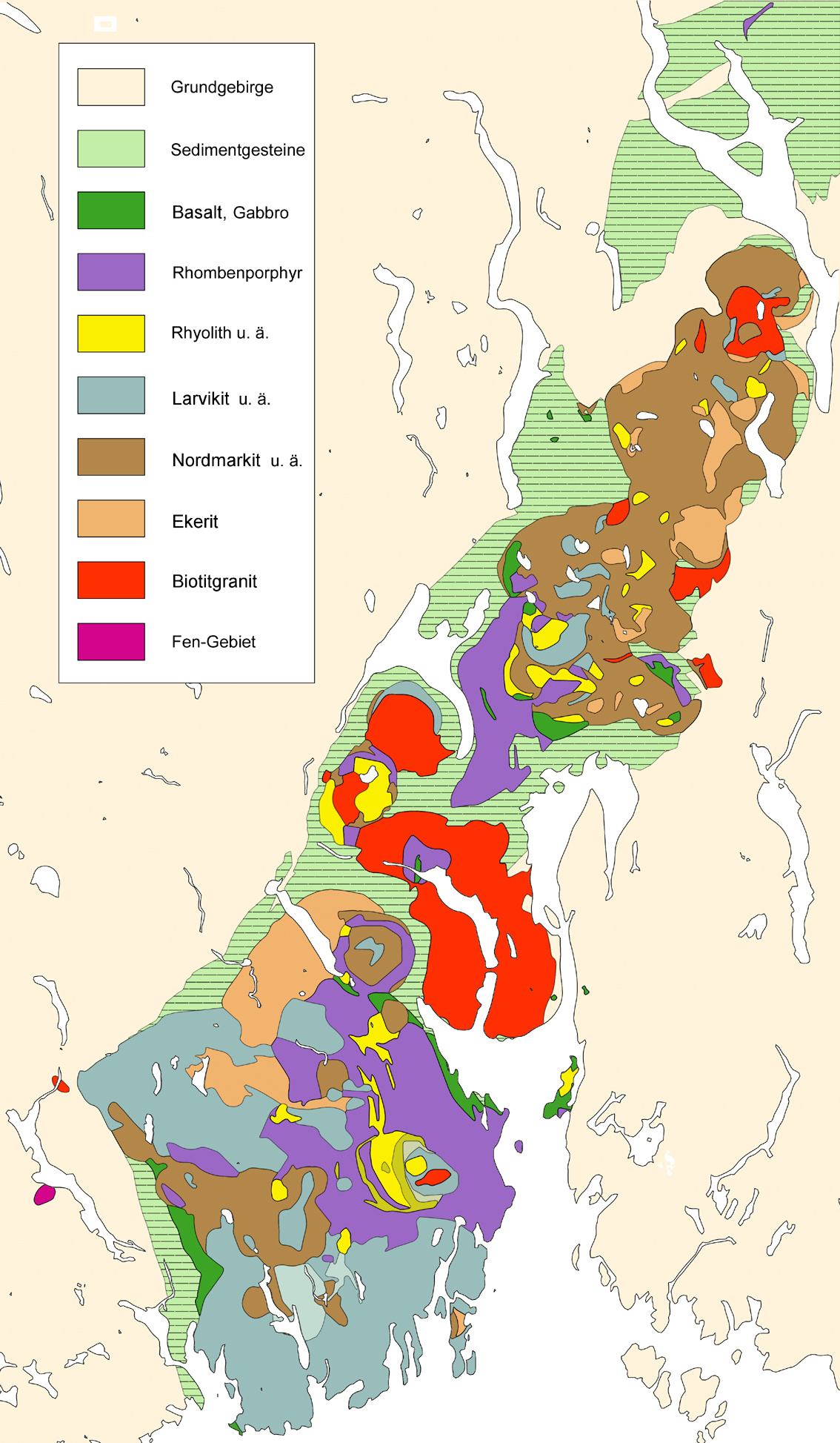 5. Magmatisches Nachspiel mit großen syenitischen Batholithen (270-250 Ma) von Alkali-Syeniten bis Alkali-Graniten wie Nordmarkit und Ekerit. Die Plutonite dringen in die Lavaergüsse, Calderen und früheren Batholithe auf und verwischen teilweise ältere Strukturen.