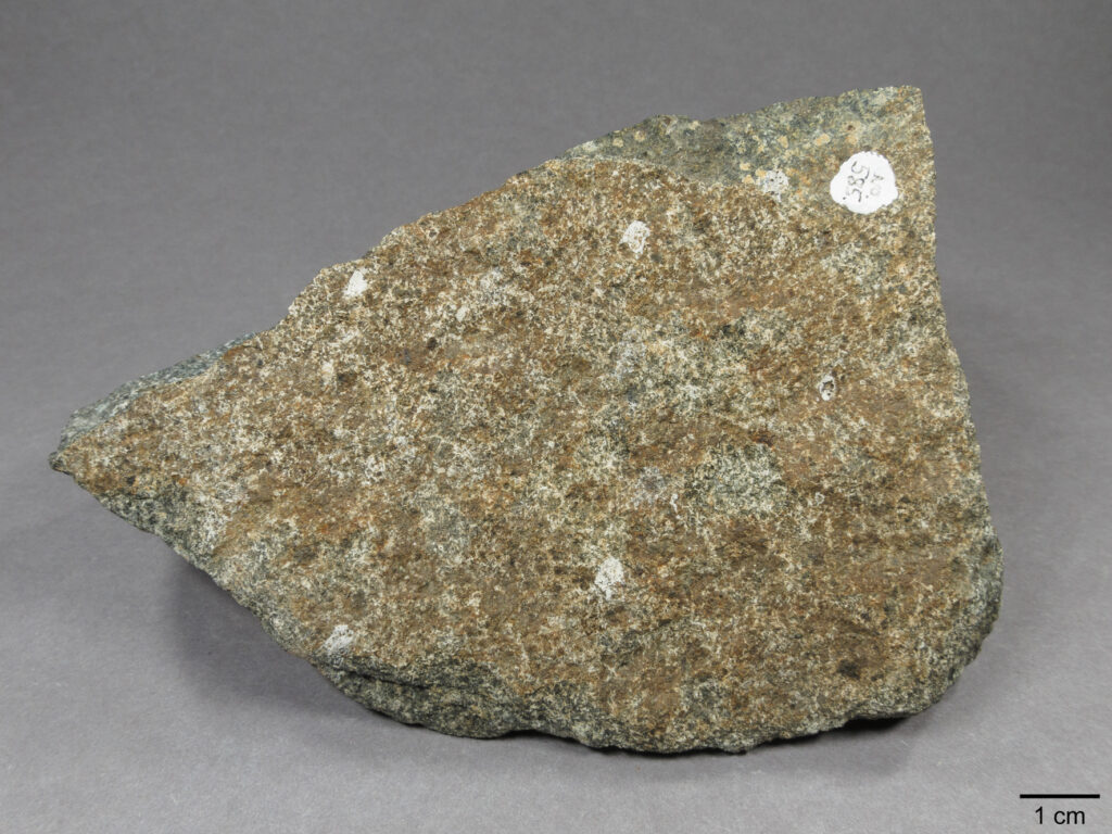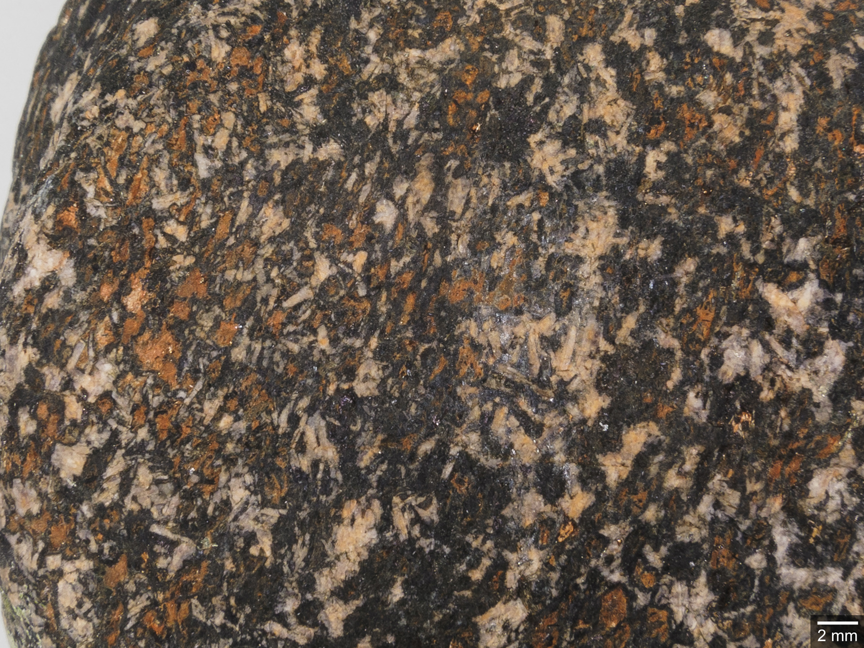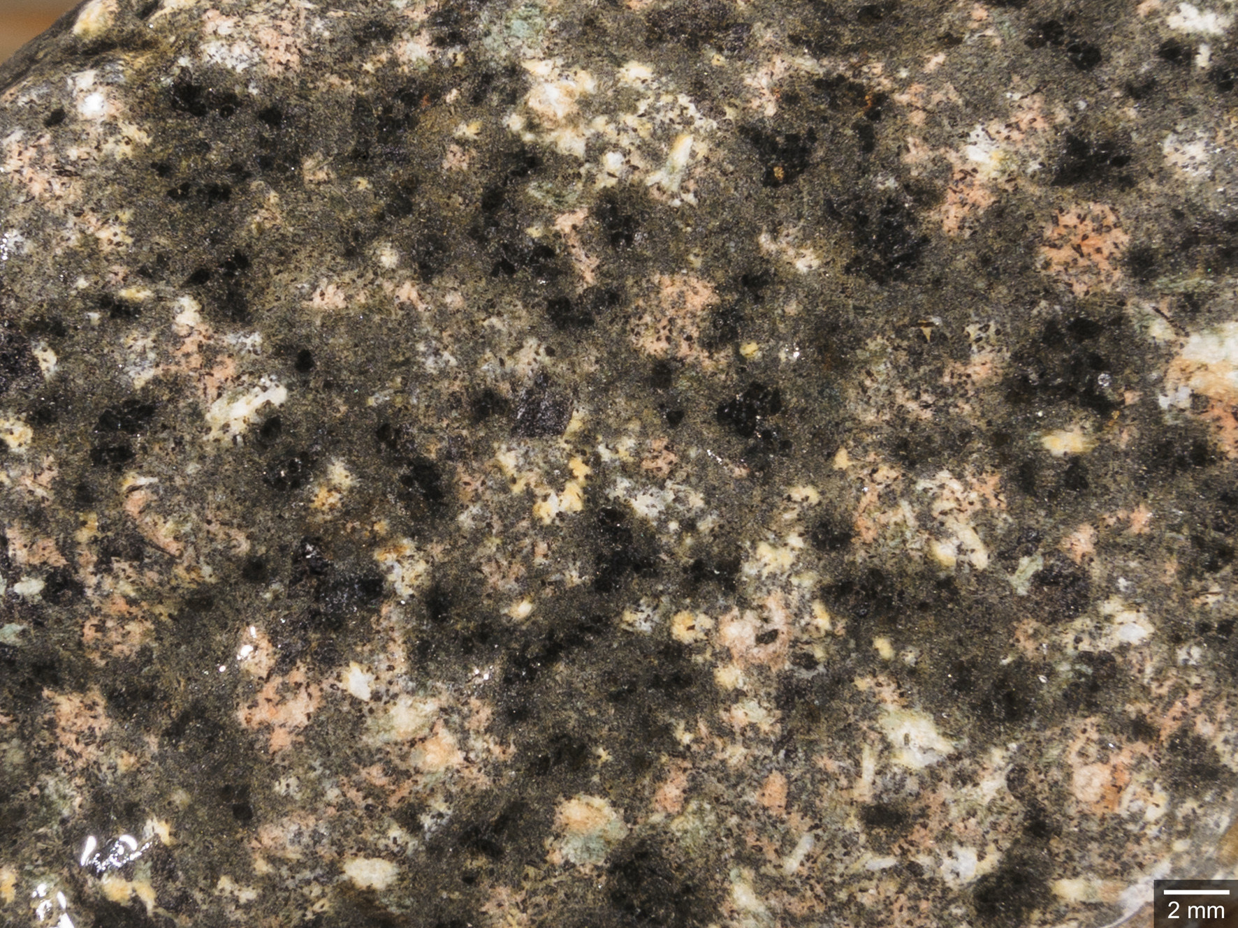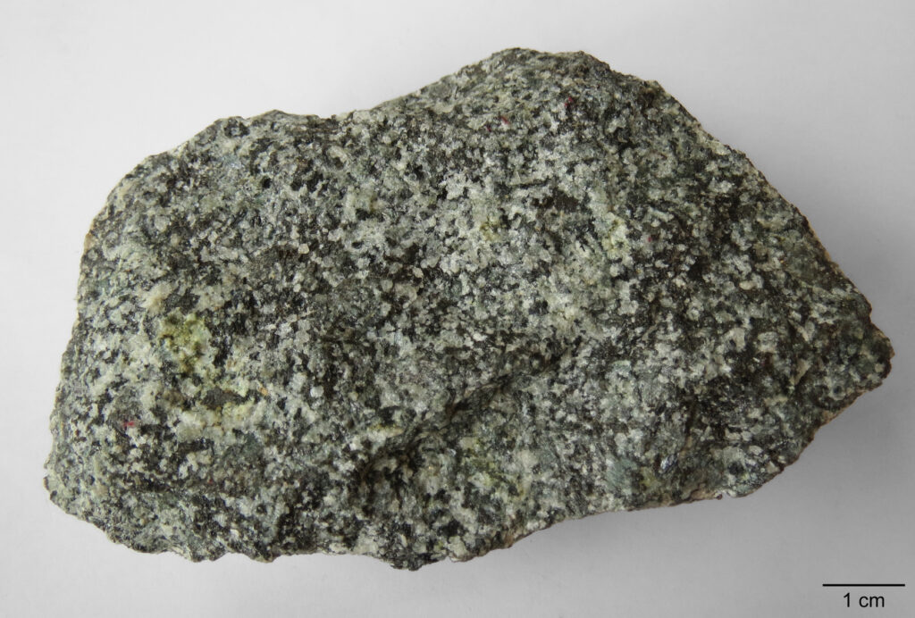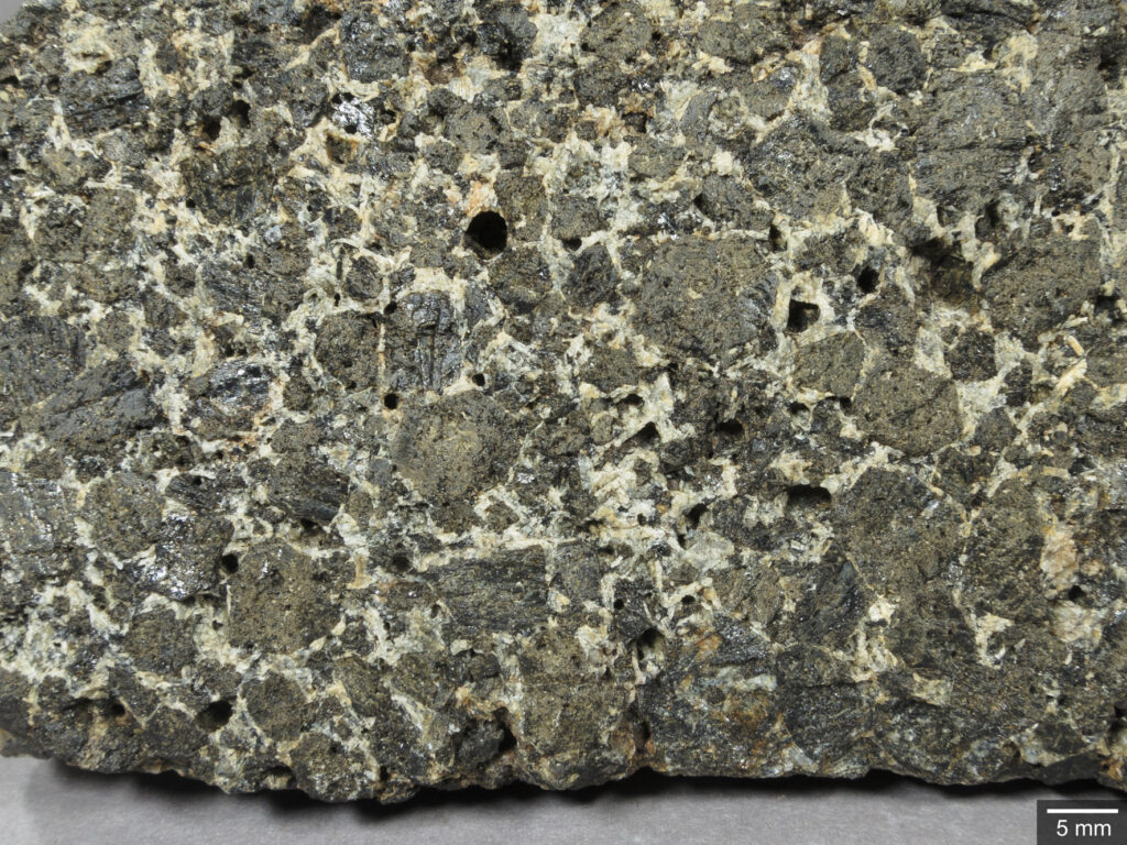 Abb. 18: Nahaufnahme. Das Gestein weist einen hohen Gehalt an Titanomagnetit auf, sichtbar als schwarze Punkte mit grünen Säumen. Die kleinen weißen, gelblichen bis blassroten Feldspatkörner sind von Hand nicht unterscheidbar.