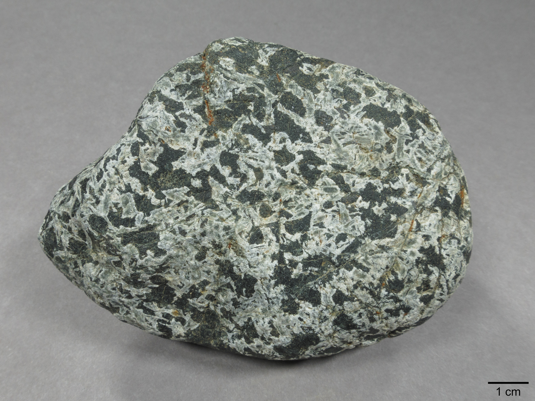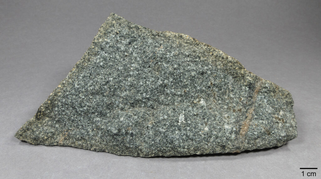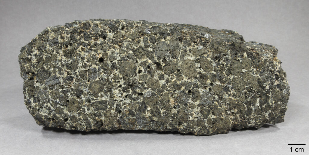 Abb. 9: grobkörniger und pyroxenreicher Gabbro, Anstehendprobe von Randviksholmen (NOR), ex coll. H. Arildskov.