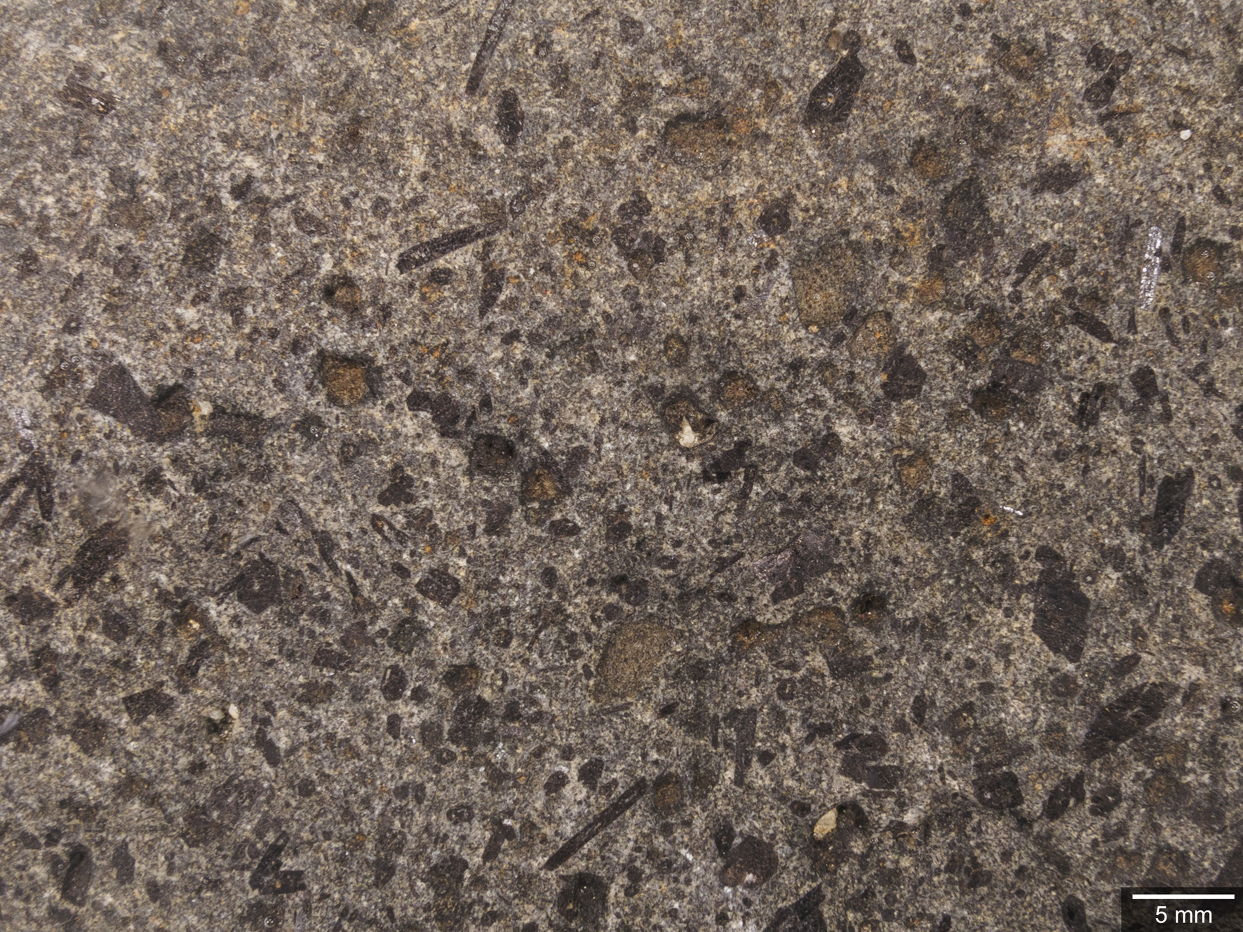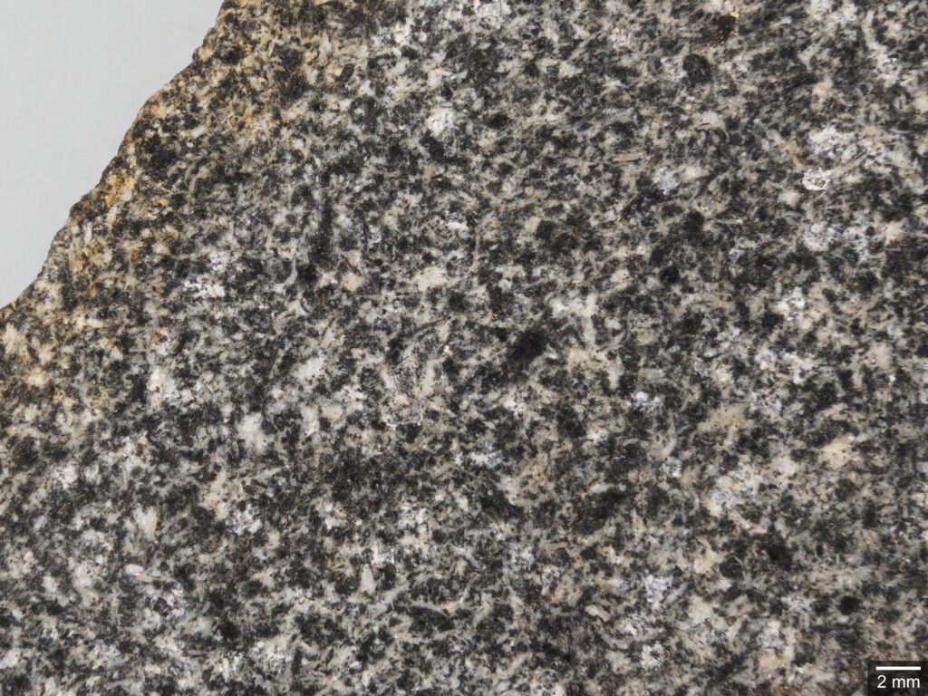 Abb. 16: Nahaufnahme der nassen Oberfläche. Das feinkörnige Gefüge erlaubt keine Unterscheidung von Plagioklas und Alkalifeldspat (beide weiß). Olivin bildet größere schwarze und unregelmäßig begrenzte Aggregate. Titanomagnetit, nachweisbar mit einem Handmagneten, ist in größerer Menge vorhanden.