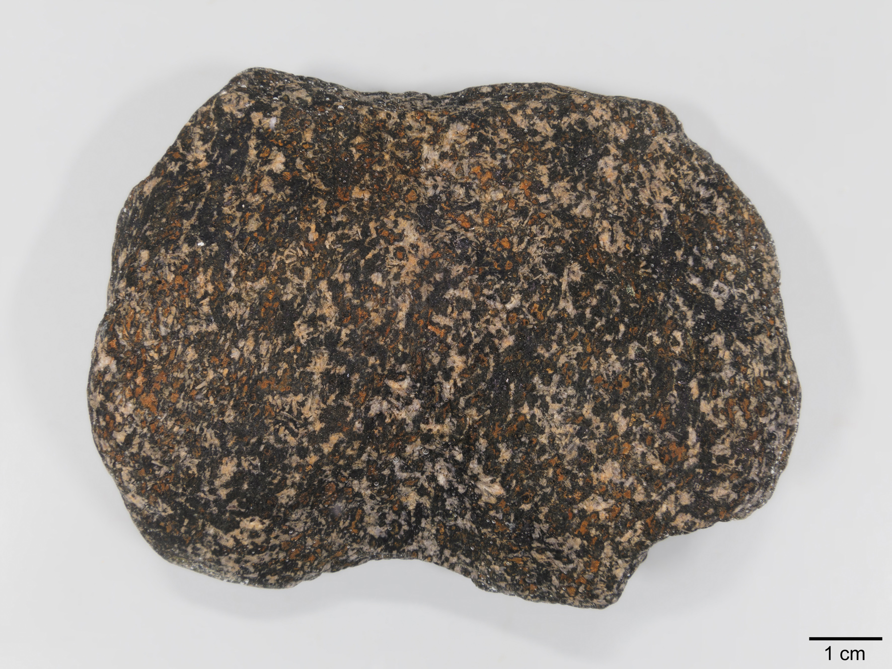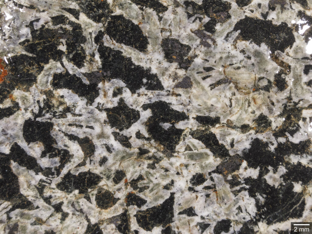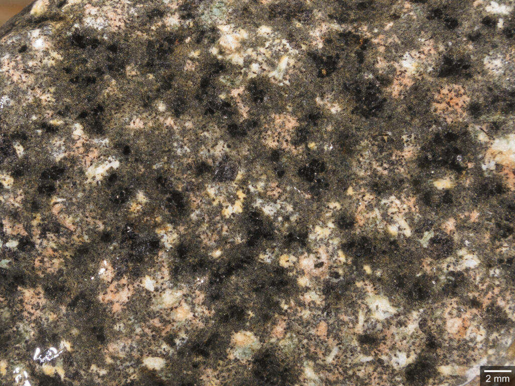 Abb. 3: Als „Oslo-Essexit“ bestimmtes gabbroides Gestein mit porphyrischem Gefüge (schwarz: Amphibol, grünlichschwarz: Klinopyroxen + etwas Olivin?). Geschiebe von Verket (NOR), Breite 86 mm, ex coll. H. Arildskov.