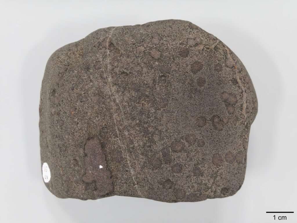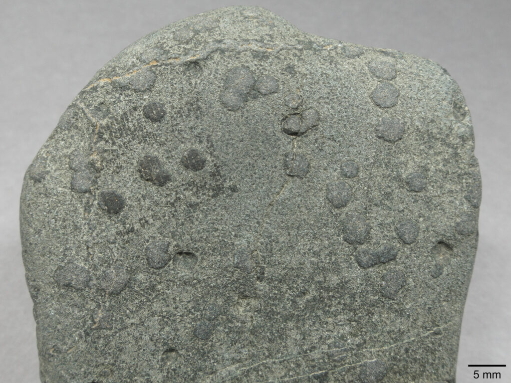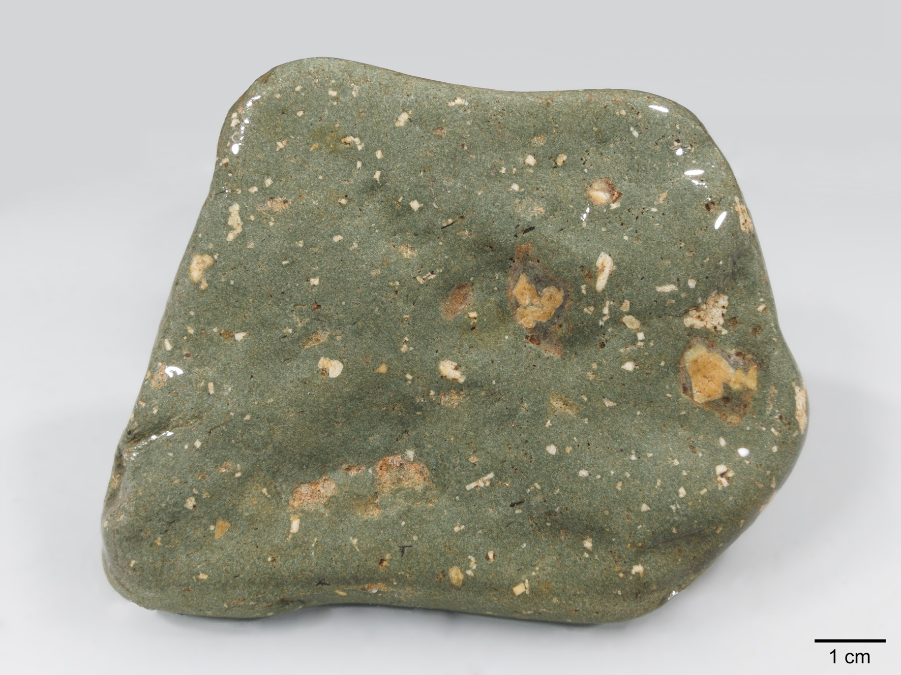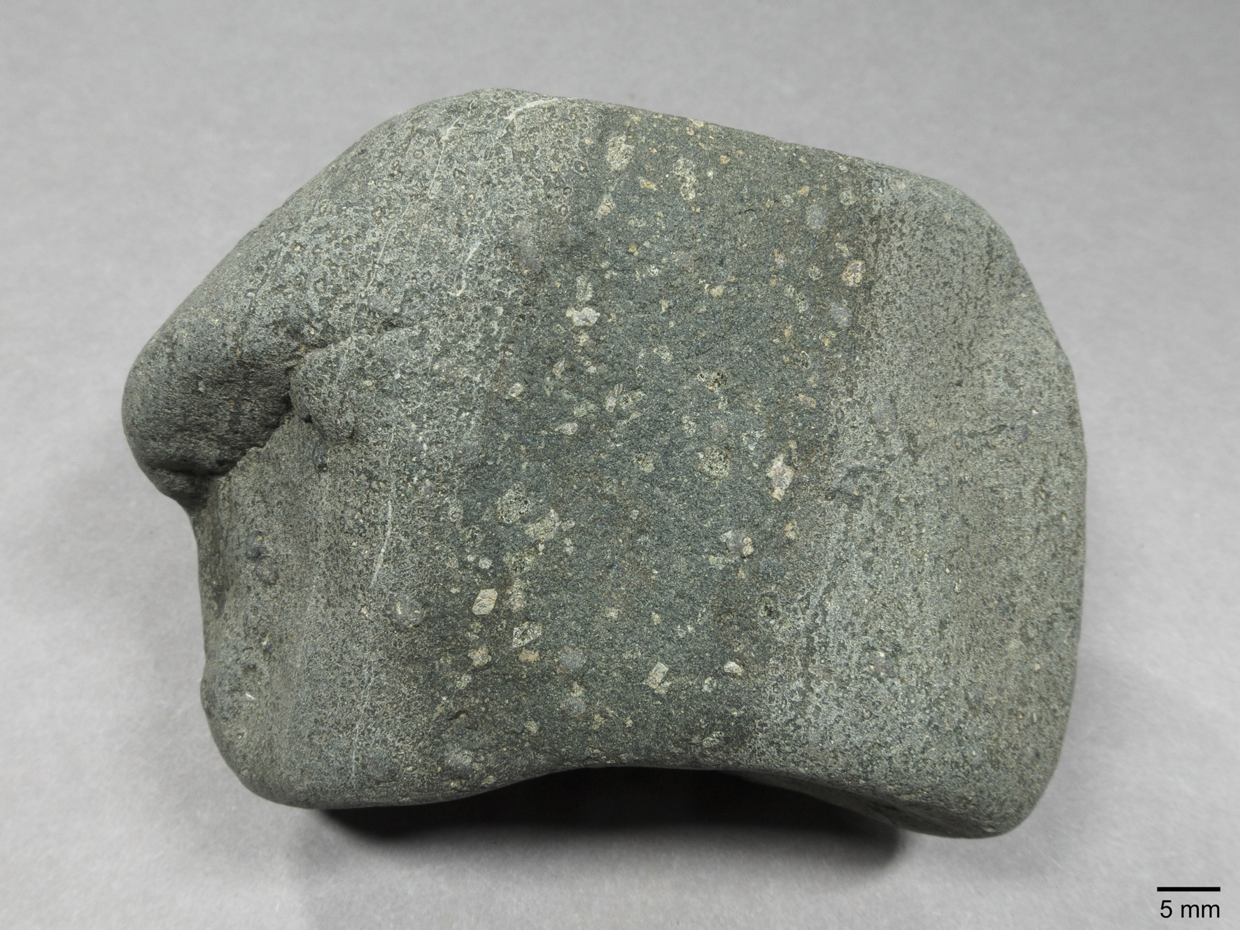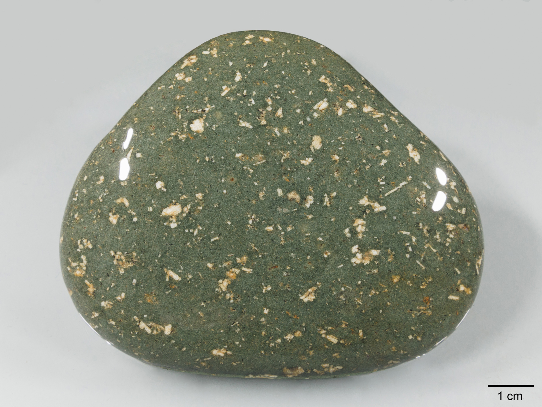 Ein Geschiebefund von Hökholz ist ein feinkörniger basischer Vulkanit mit vereinzelten schwarzen Pyroxen-Einsprenglingen und weißen Mandeln. In der Grundmasse sind zahlreiche nadelförmige dunkle Minerale erkennbar, wahrscheinlich Ägirin (ein Na-Fe-Pyroxen). Dies weist auf einen alkalireichen Vulkanit bzw. Ganggestein hin, ebenso der Olivin-Pyroxen-(Mantel?-)Xenolith in der Bildmitte Abb. 16. Das Gestein ist ohne Dünnschliffuntersuchung nicht näher bestimmbar. Vermutet wird eine Herkunft aus dem Oslograben, Vergleiche mit Anstehendproben könnten in Richtung Madeirit weisen.