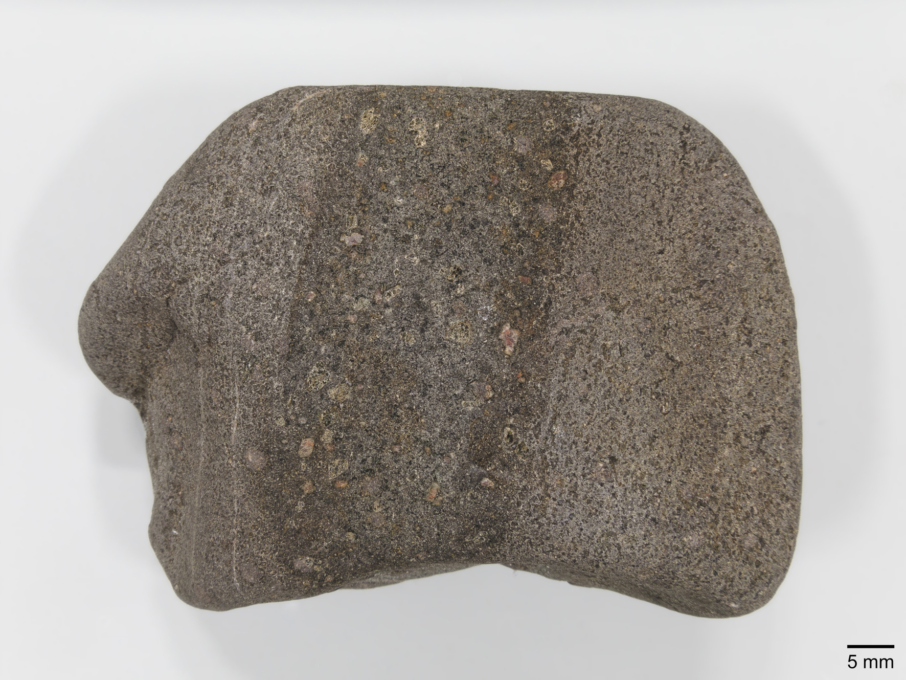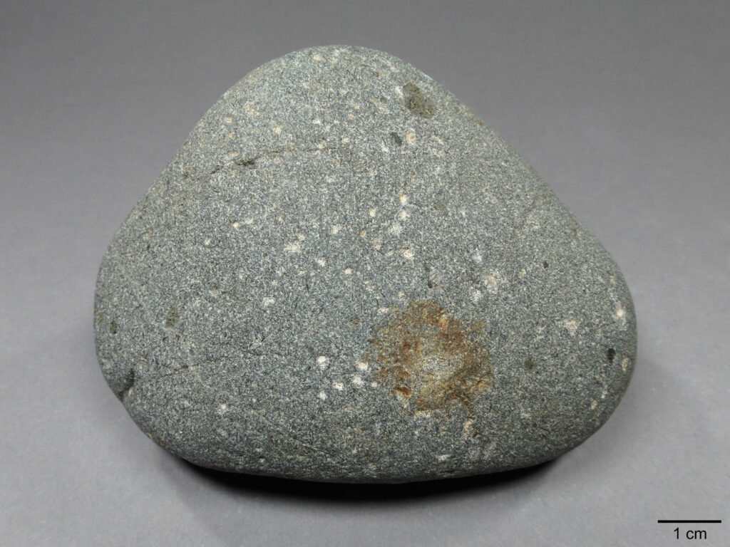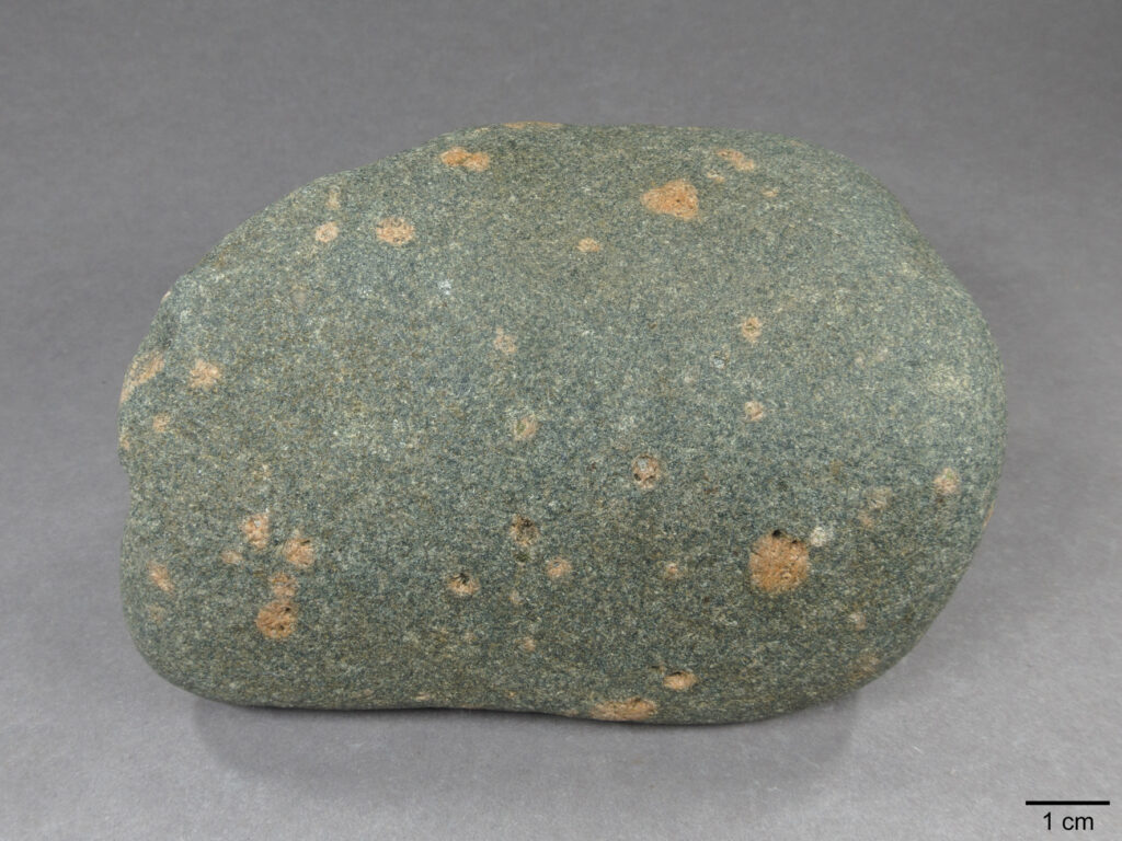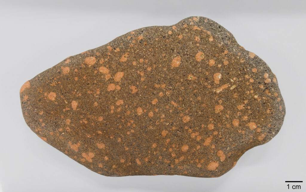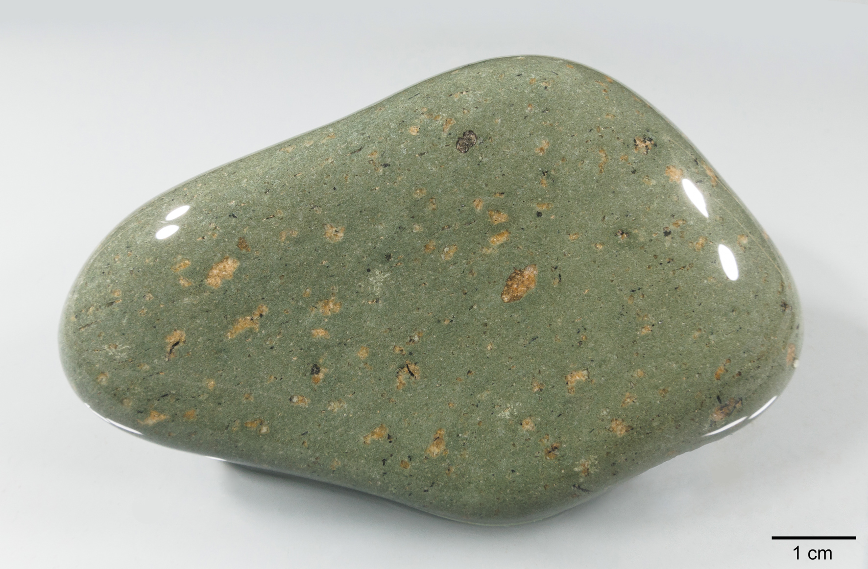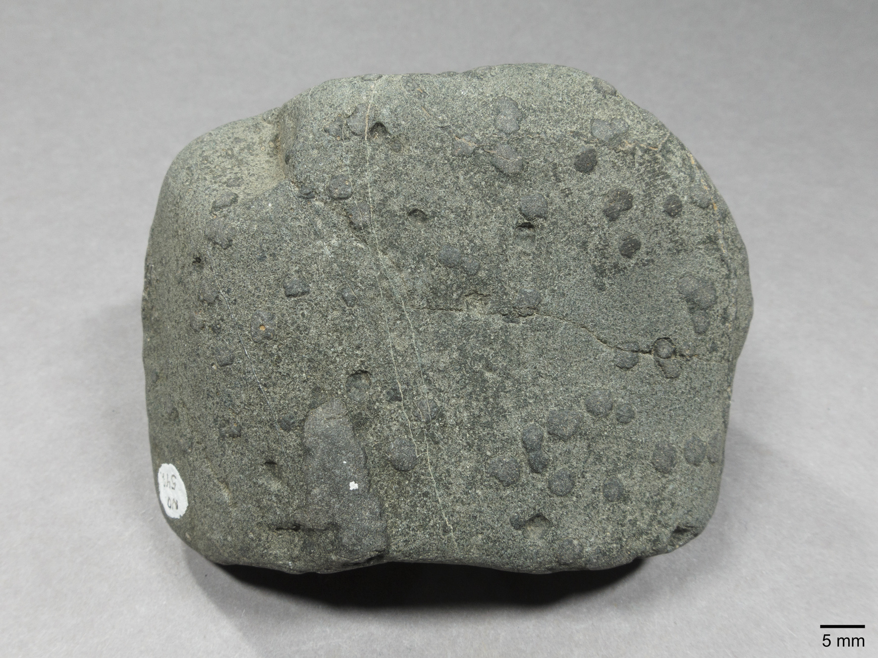 Ein Geschiebefund von Hökholz ist ein feinkörniger basischer Vulkanit mit vereinzelten schwarzen Pyroxen-Einsprenglingen und weißen Mandeln. In der Grundmasse sind zahlreiche nadelförmige dunkle Minerale erkennbar, wahrscheinlich Ägirin (ein Na-Fe-Pyroxen). Dies weist auf einen alkalireichen Vulkanit bzw. Ganggestein hin, ebenso der Olivin-Pyroxen-(Mantel?-)Xenolith in der Bildmitte Abb. 16. Das Gestein ist ohne Dünnschliffuntersuchung nicht näher bestimmbar. Vermutet wird eine Herkunft aus dem Oslograben, Vergleiche mit Anstehendproben könnten in Richtung Madeirit weisen.
