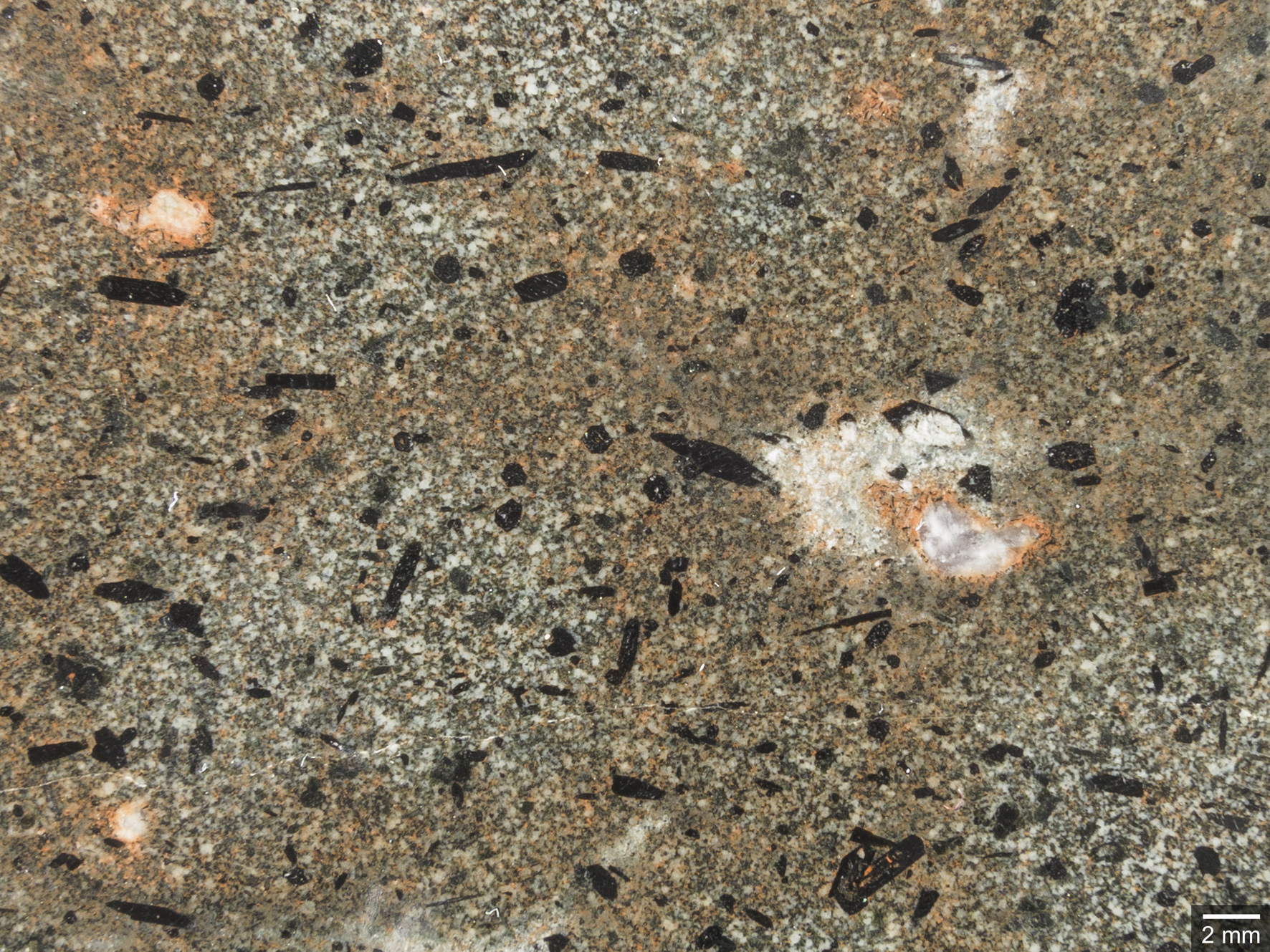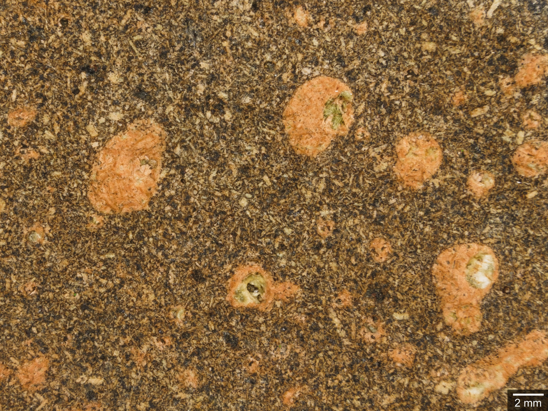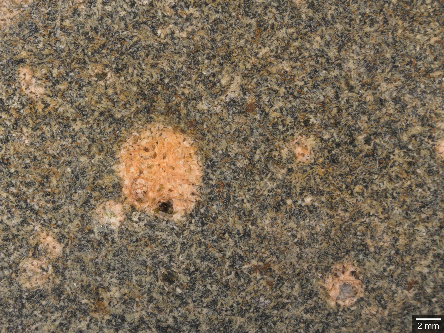 Abb. 13: Nahaufnahme. Die Grundmasse besteht aus Feldspat und einem gelblichbraunen Mineral (kein Glimmer), das Gestein reagiert auf einen Handmagneten. Die dunkleren kugeligen Aggregate weisen eine Zonierung auf (heller Saum), enthalten leistenförmige Feldspäte (Plagioklas) und sind nicht magnetisch.