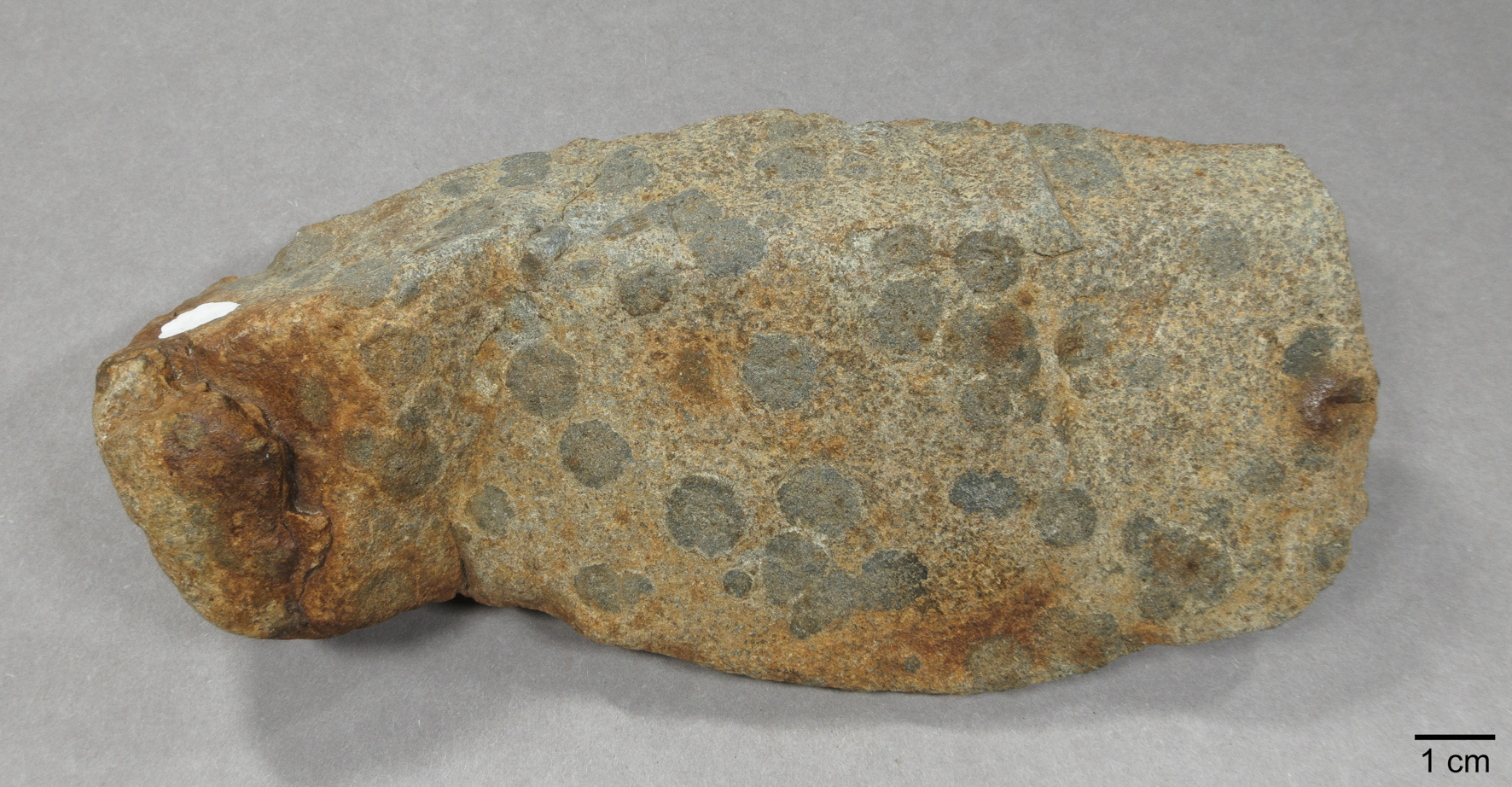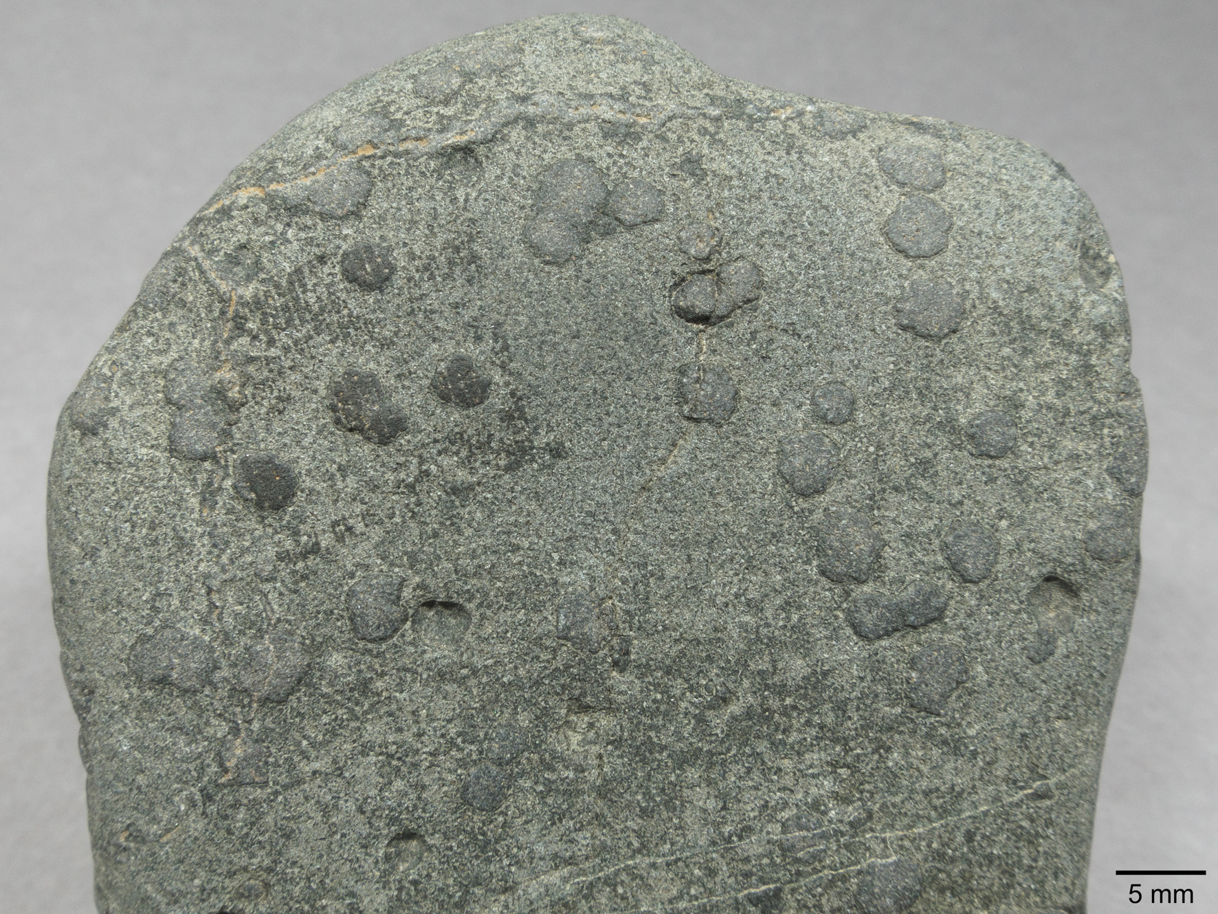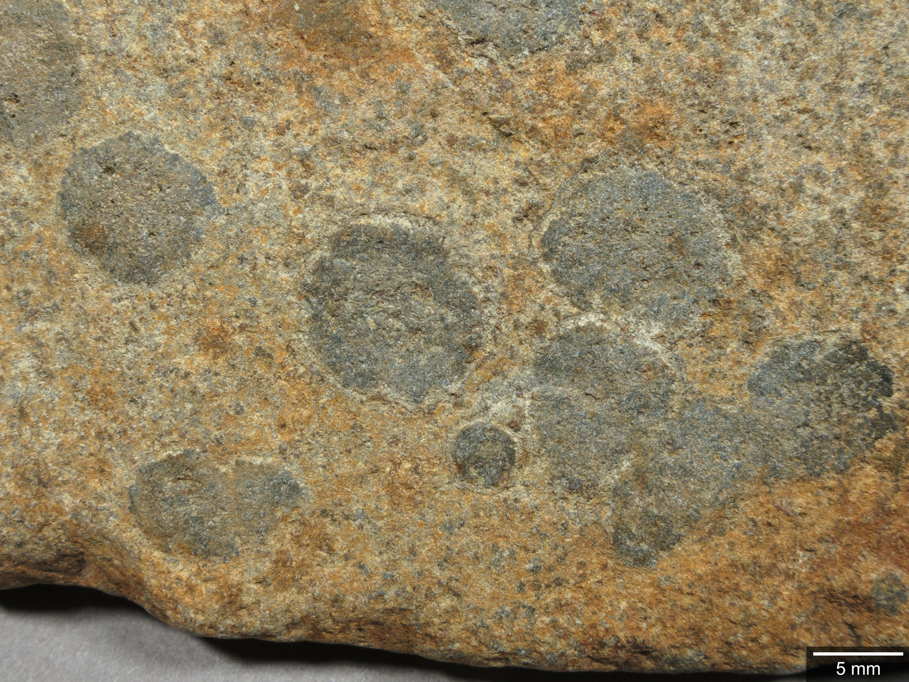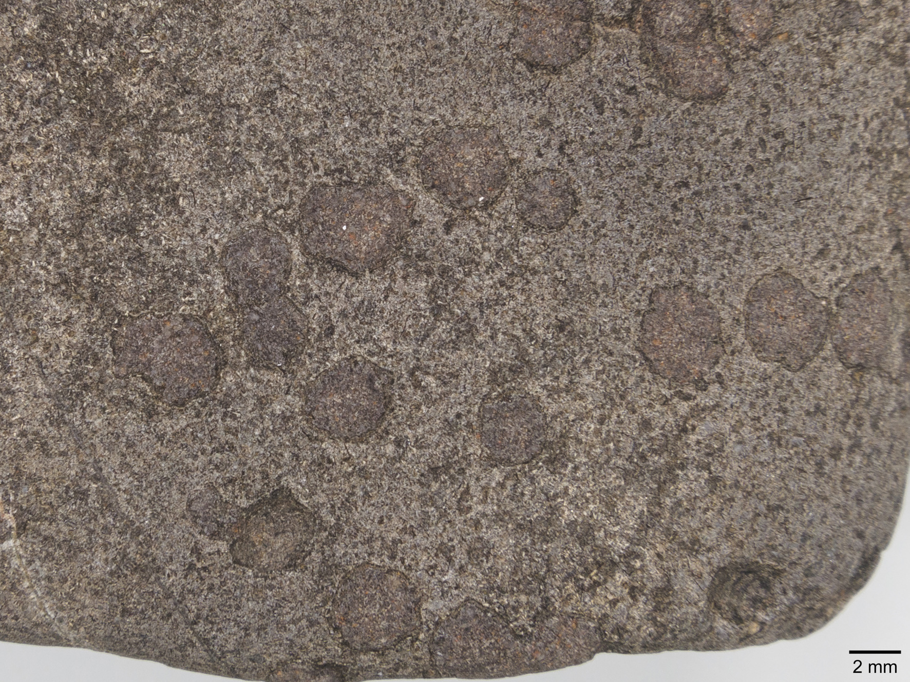 Abb. 13: Nahaufnahme. Die Grundmasse besteht aus Feldspat und einem gelblichbraunen Mineral (kein Glimmer), das Gestein reagiert auf einen Handmagneten. Die dunkleren kugeligen Aggregate weisen eine Zonierung auf (heller Saum), enthalten leistenförmige Feldspäte (Plagioklas) und sind nicht magnetisch.