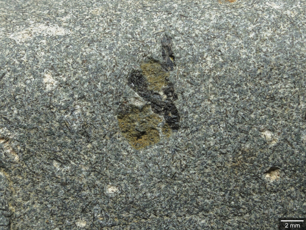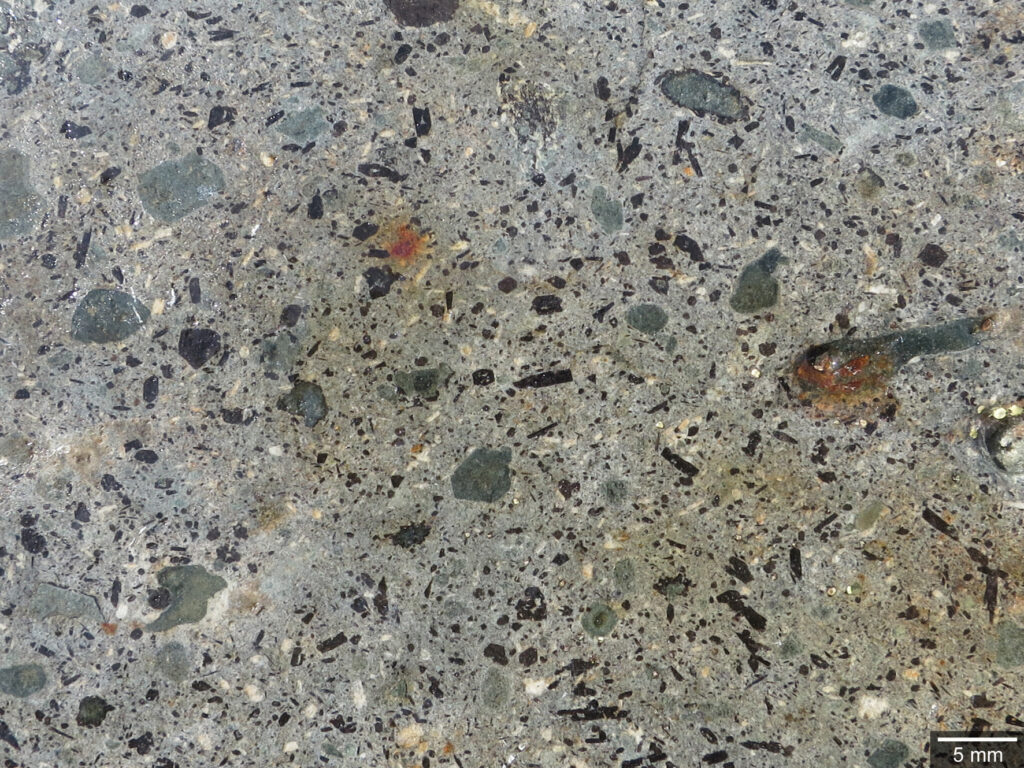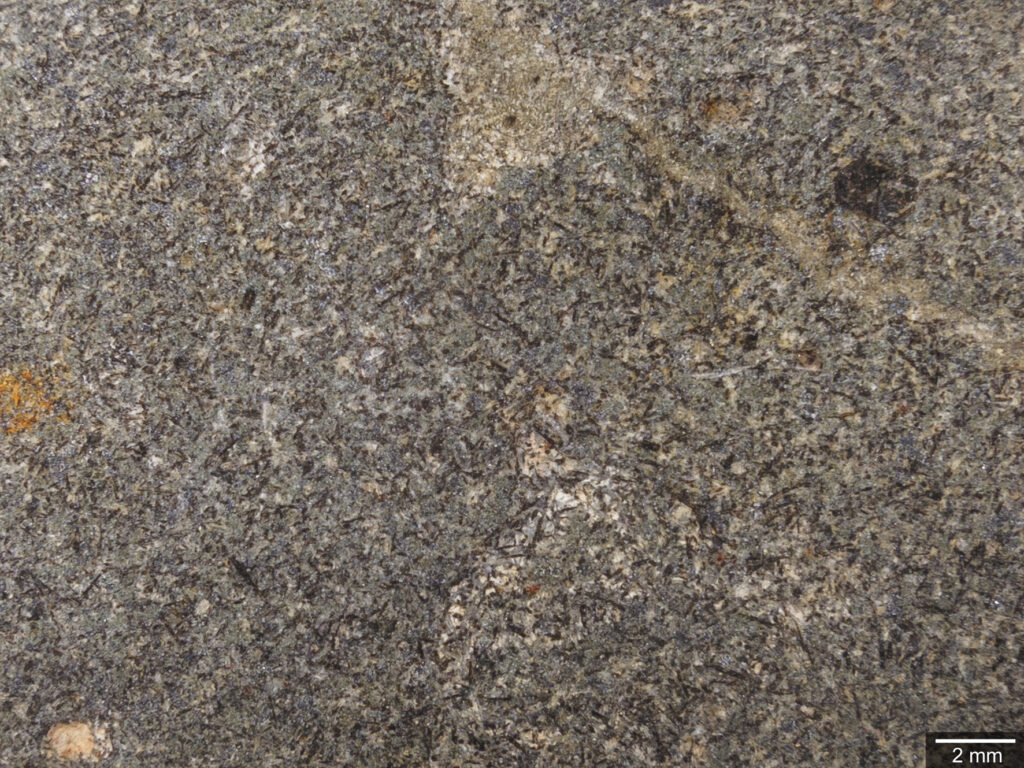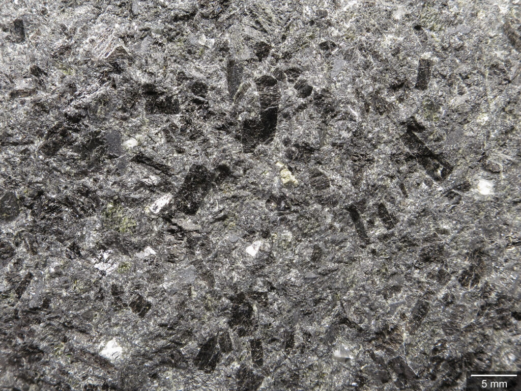 Abb. 2: Nahaufnahme der feinkörnigen Grundmasse mit schwarzen Pyroxen-Einsprenglingen und etwas grünem Olivin.