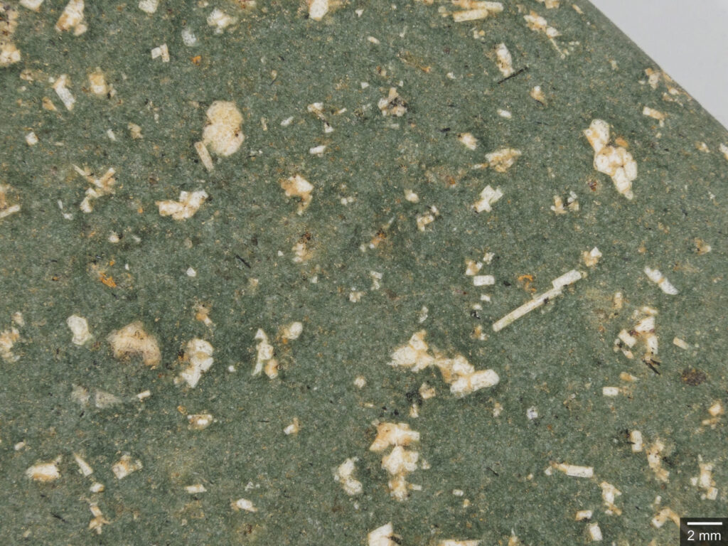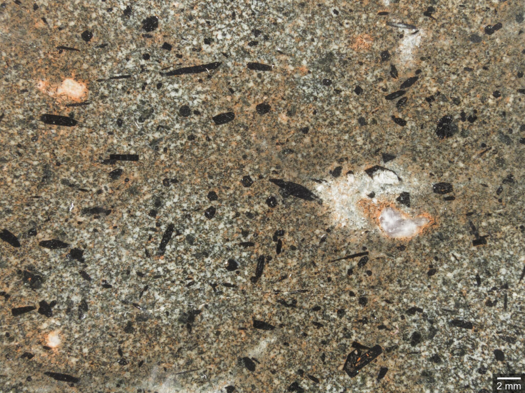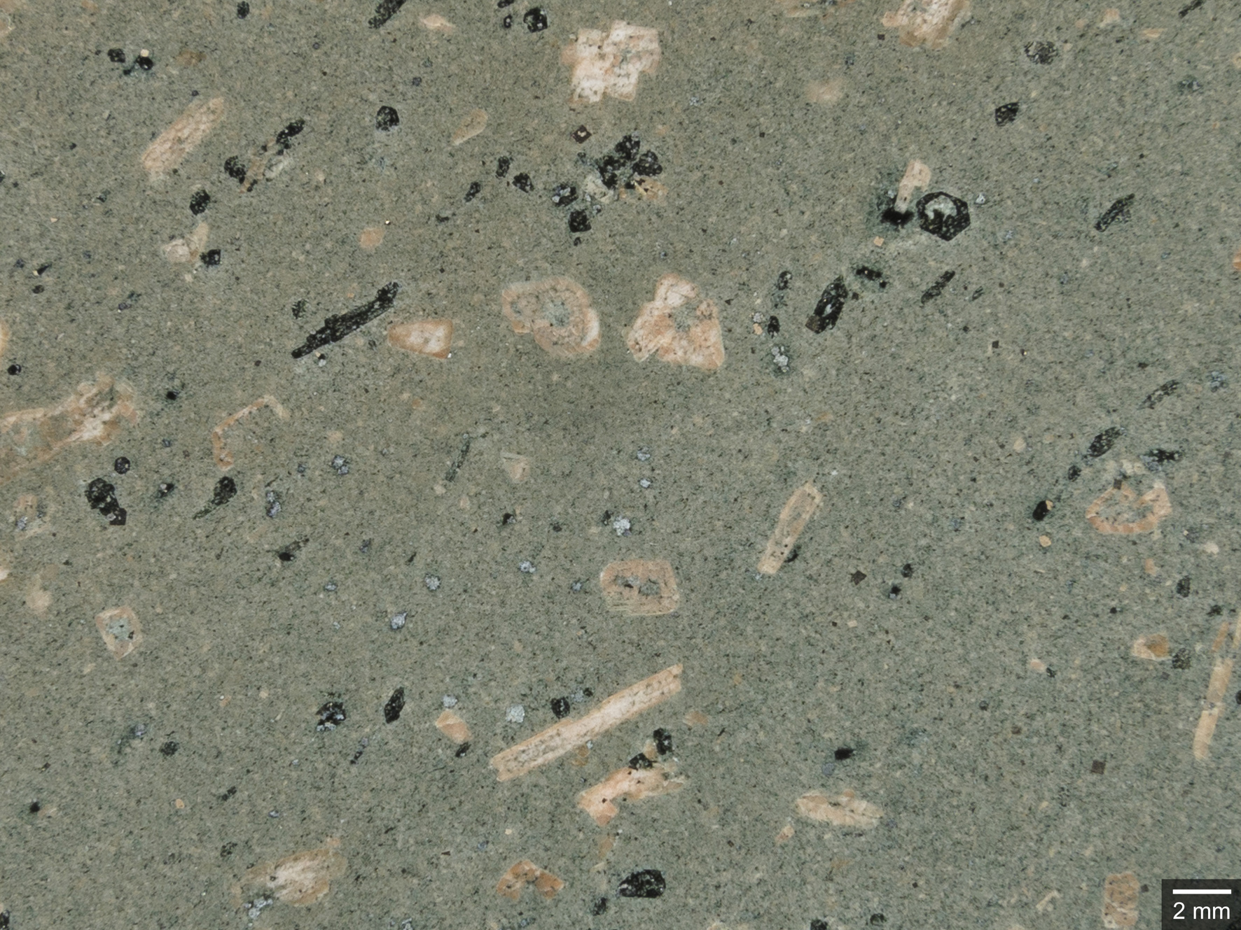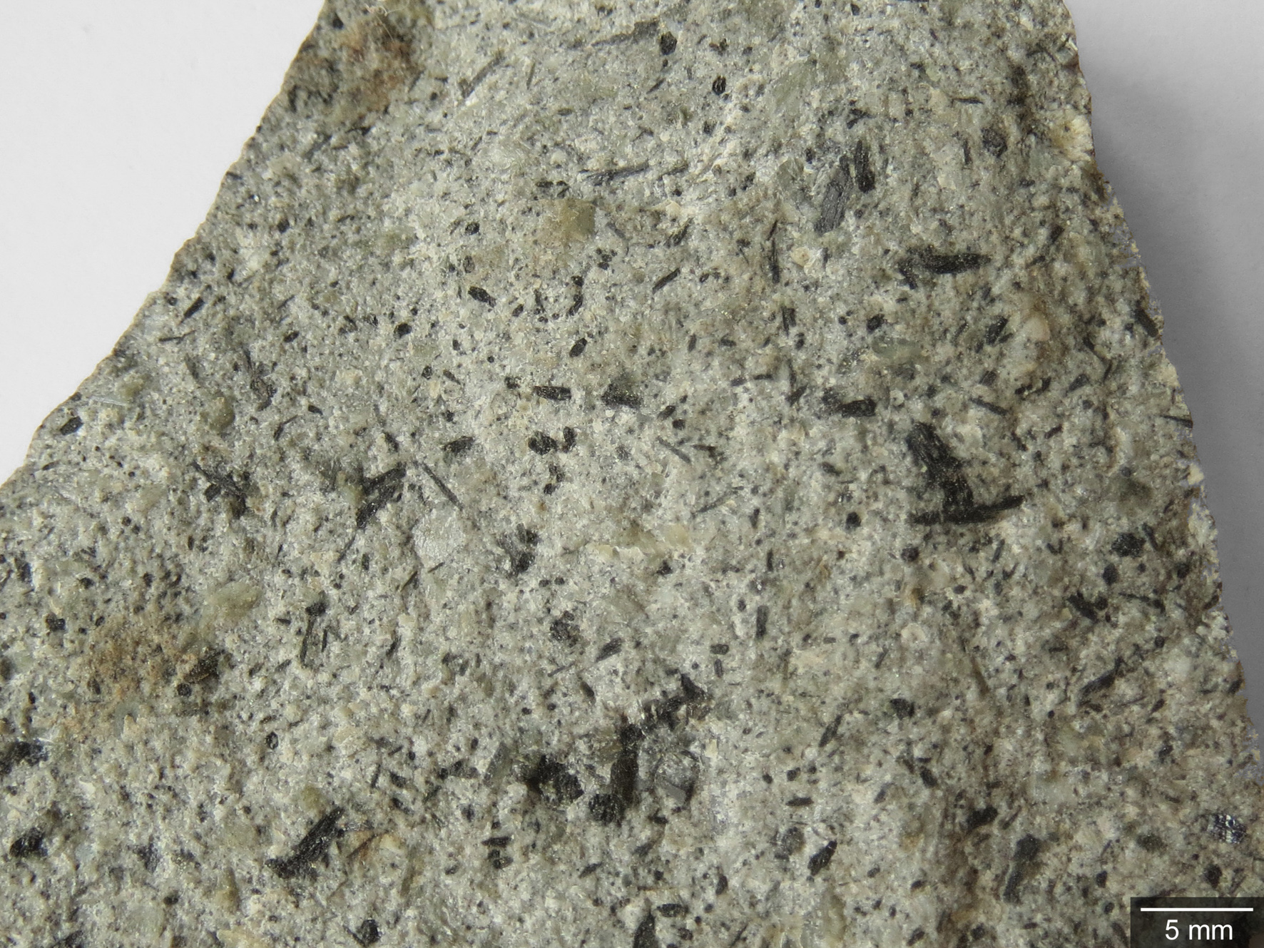 Abb. 2: Nahaufnahme der feinkörnigen Grundmasse mit schwarzen Pyroxen-Einsprenglingen und etwas grünem Olivin.