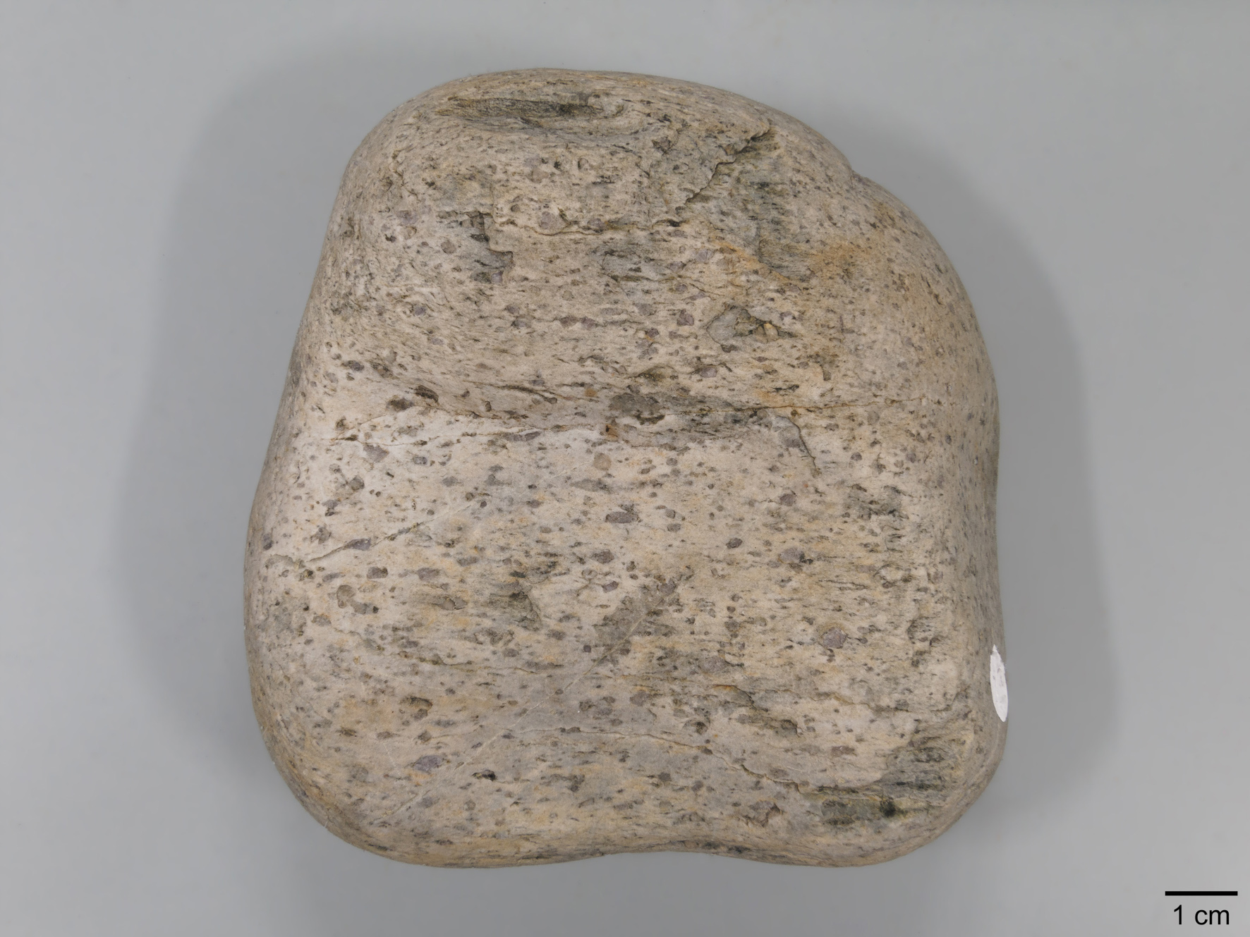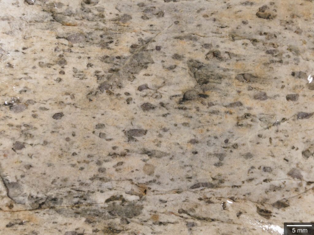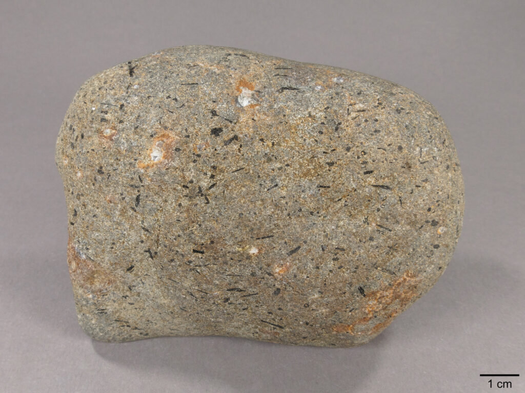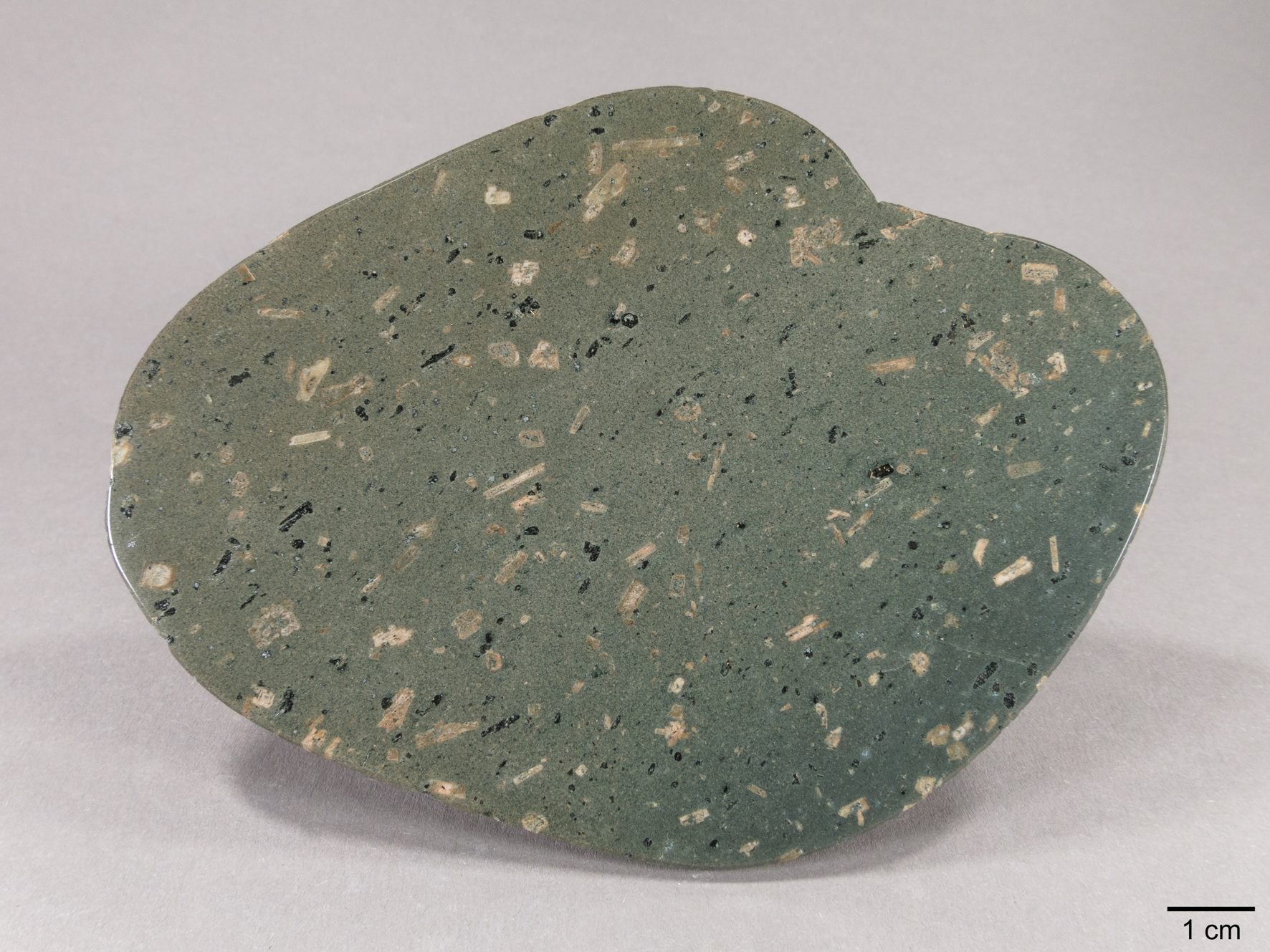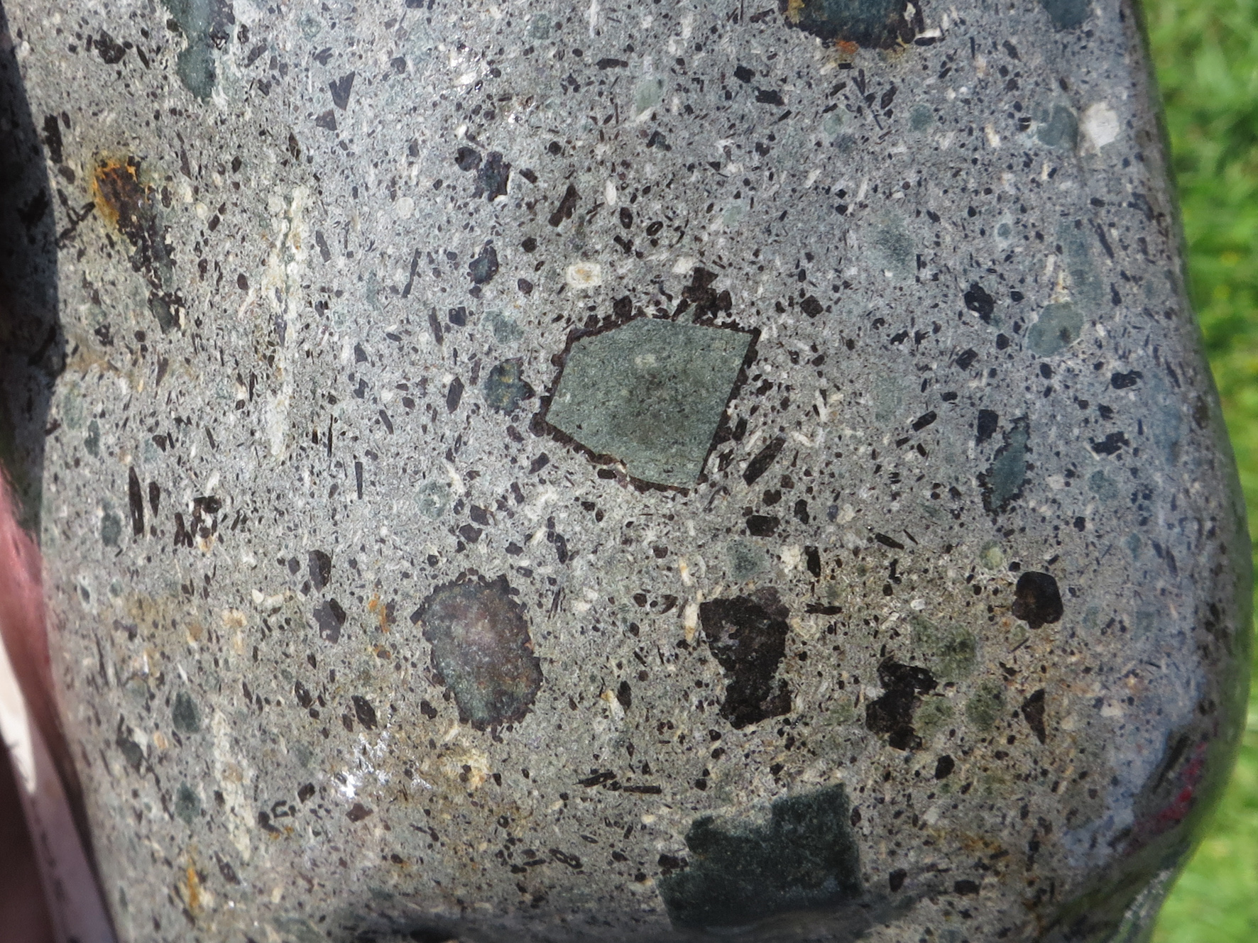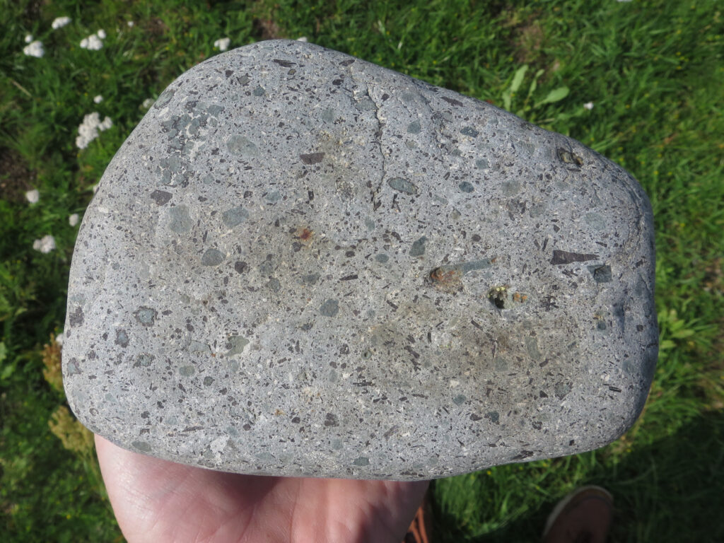 Die hellgraue und feldspatreiche Grundmasse enthält weiße und leistenförmige Feldspat-Einsprenglinge sowie säulige bis stengelige dunkle Minerale (Pyroxen und Amphibol). Das Geschiebe ist durchsetzt mit kleineren kantigen bis rundlichen Einschlüssen eines feinkörnigen Fremdgesteins.