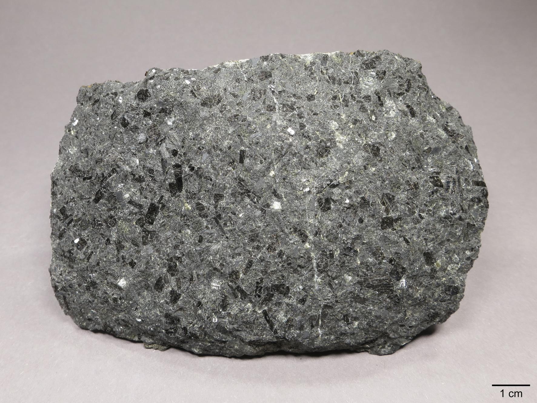 Abb. 1: Camptonit, Anstehendprobe, SE von Jarenvatnet (NOR), N Gran, östl. d. Strasse (60.37435, 10.56391). M. Bräunlich leg., Slg. der BGR in Berlin-Spandau.