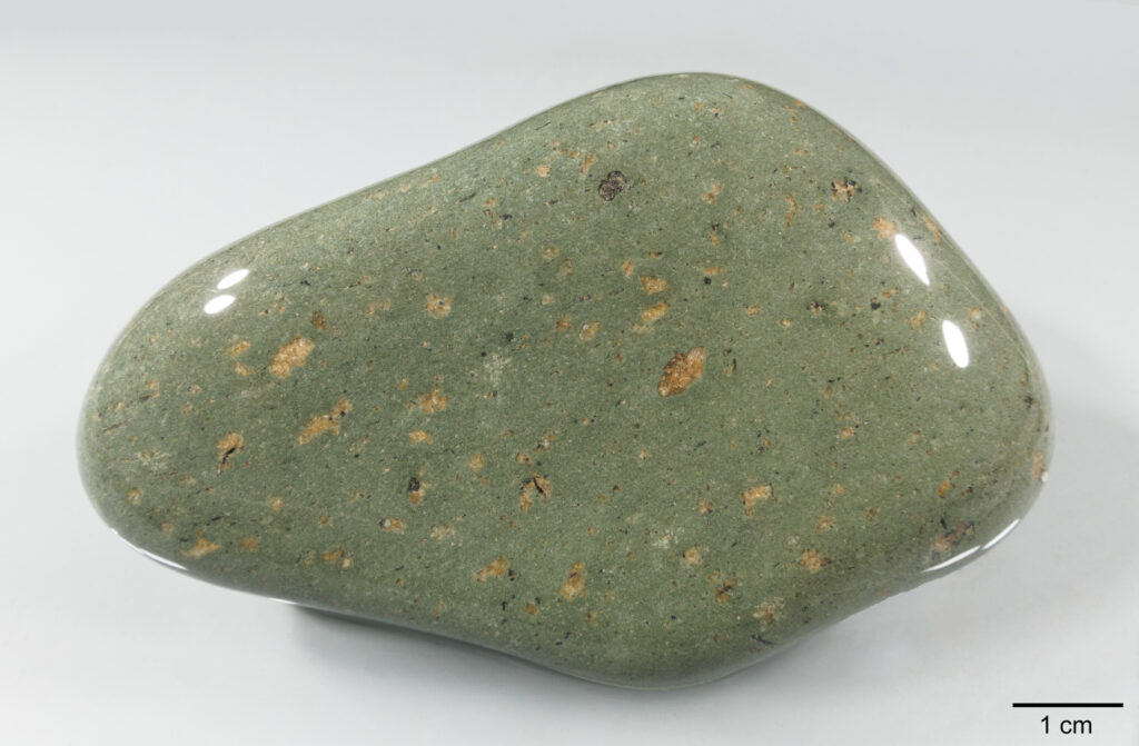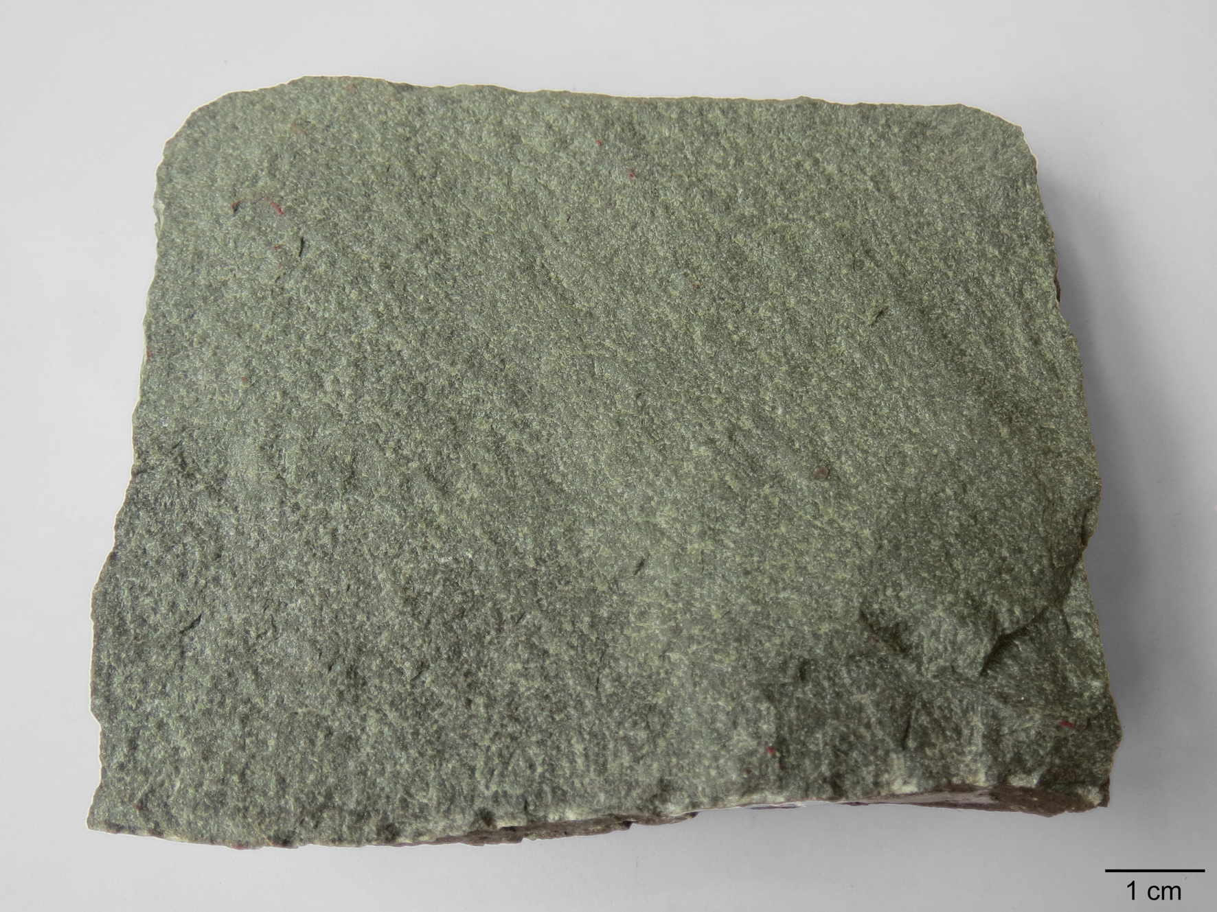 Abb. 31: Sölvsbergit, feinkörniges grünes Gestein mit einzelnen Ägirin-Nadeln, Anstehendprobe vom SE-Hang des Sölvberget zwischen Lunner und Berget, Hadeland (NOR), Dr. Heidrich leg. 14.07.1967, Sammlung der FU Lankwitz.
