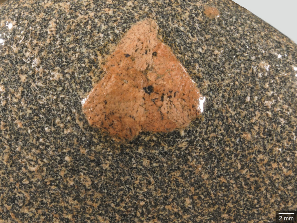 Abb. 29: Grorudit, polierte Schnittfläche, Nahgeschiebe aus Mølen (NOR), Slg. T. Brückner.
