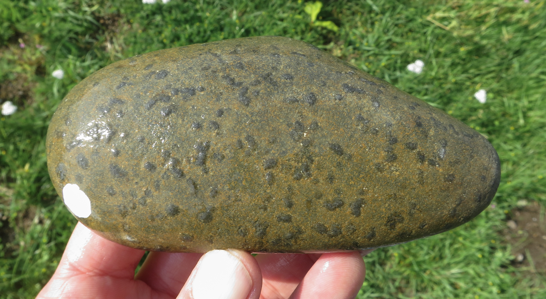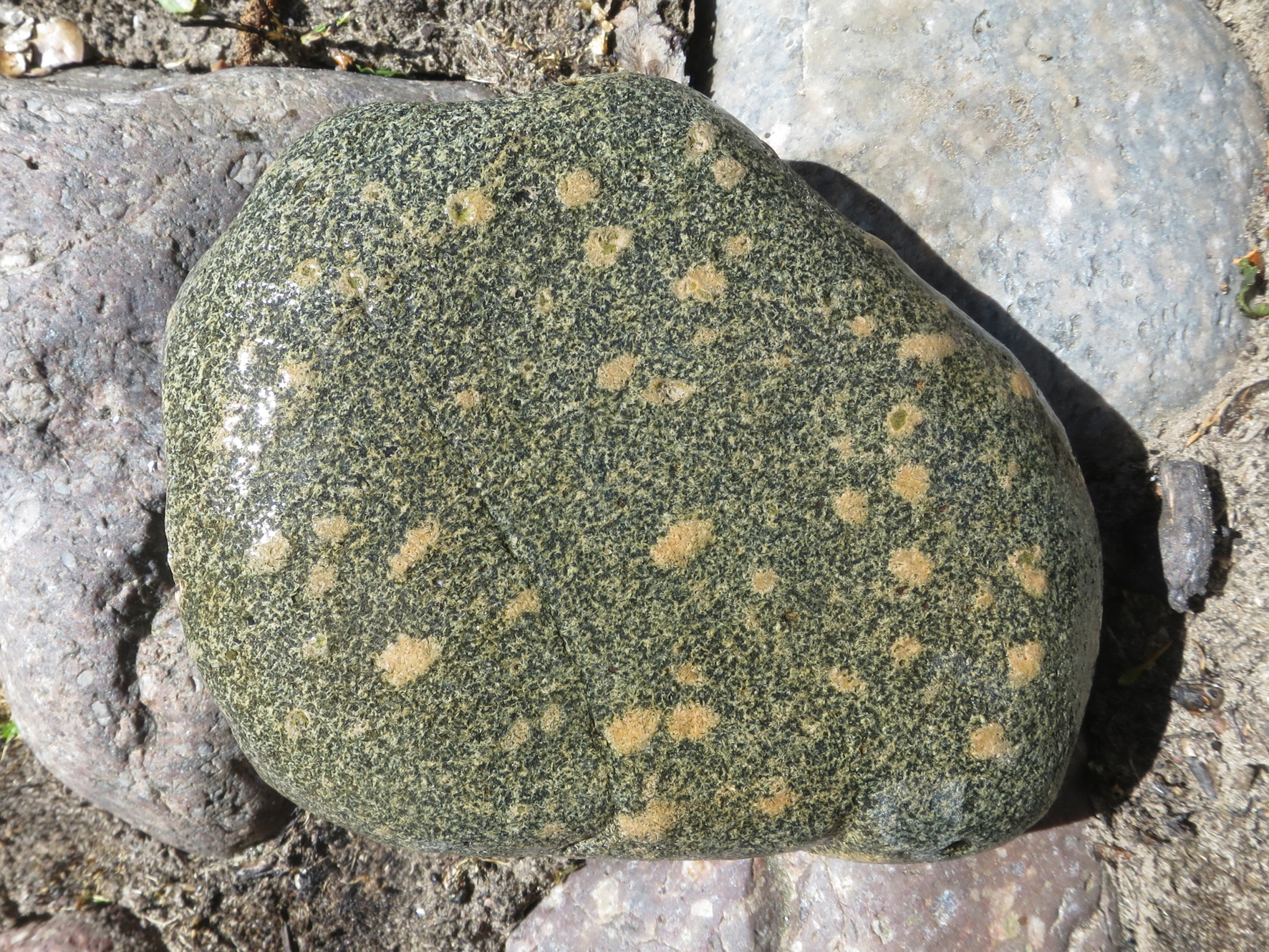 Abb. 26: Grorudit-Geschiebe mit gelblich-braunen Feldspat-Einsprenglingen, nass fotografiert, Vigsjö-Bucht (DK), leg. D. Lüttich.