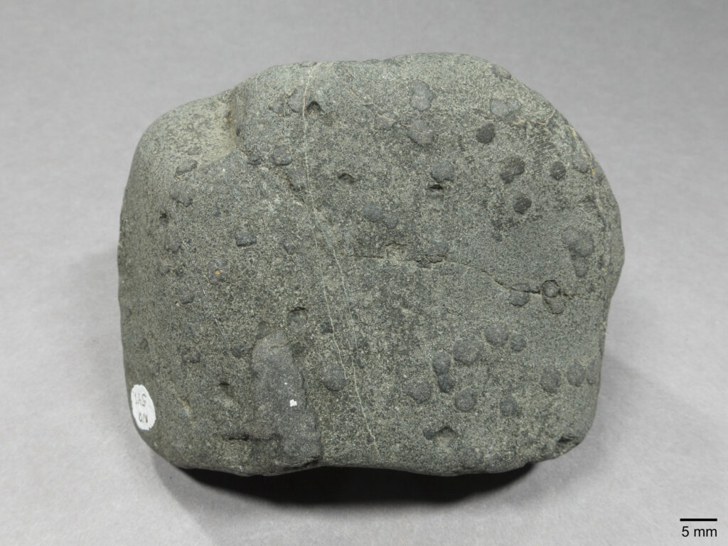 Abb. 15: Alkalivulkanit/Ganggestein mit schwarzen Pyroxen-Einsprenglingen und weißen Mandeln. Geschiebe vom Geschiebestrand Hökholz.