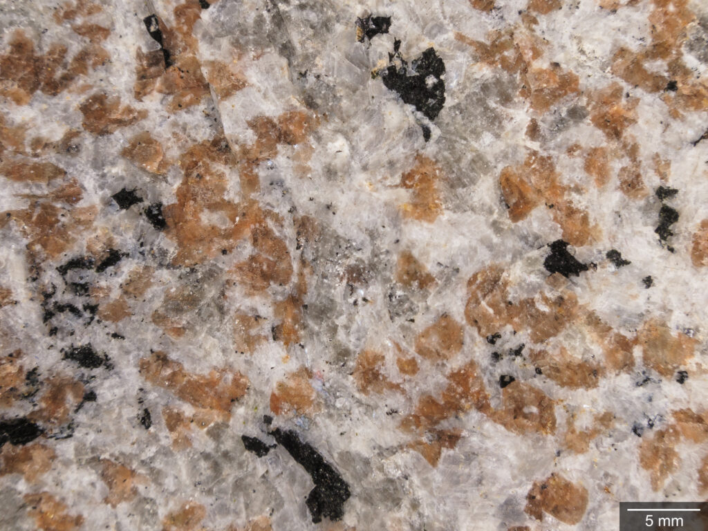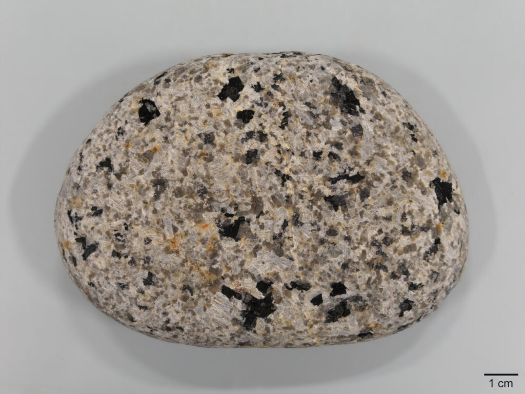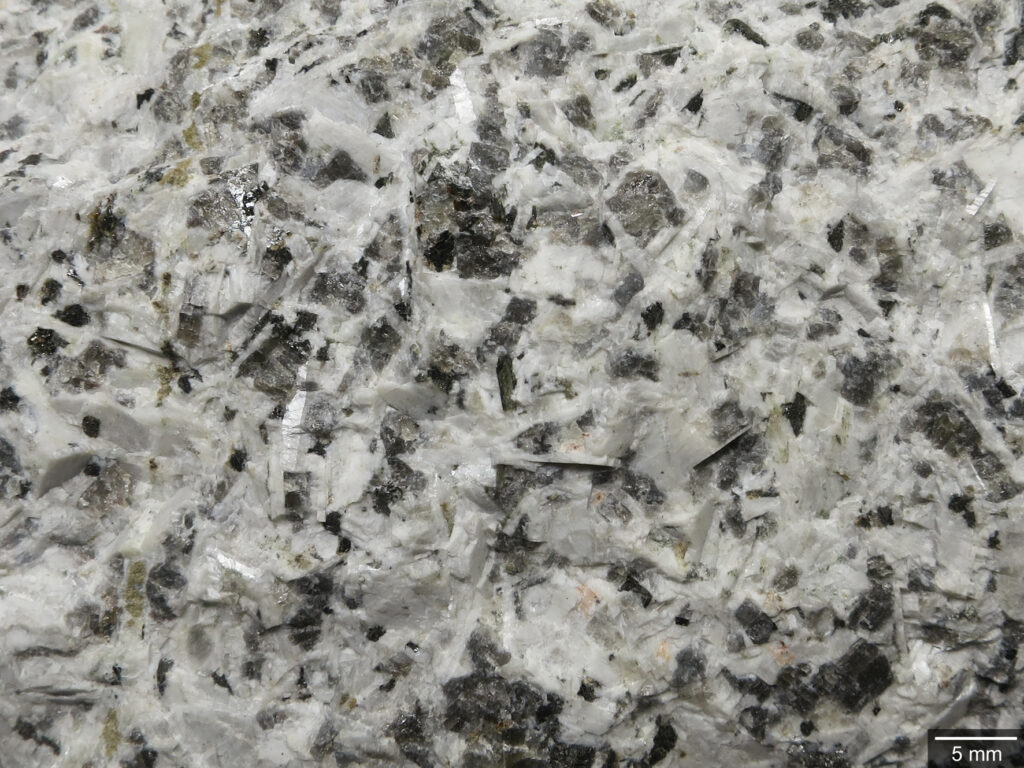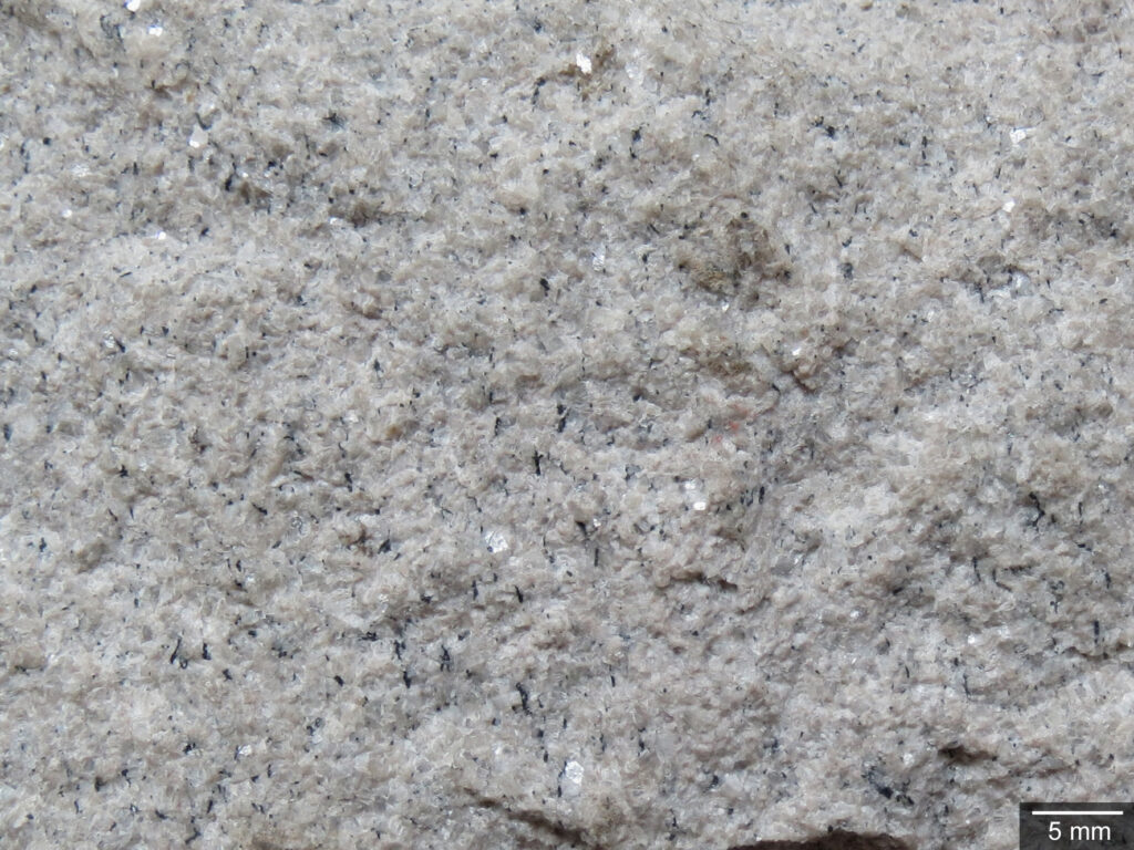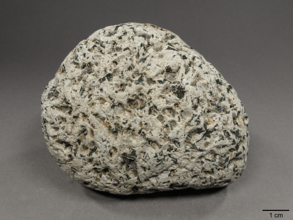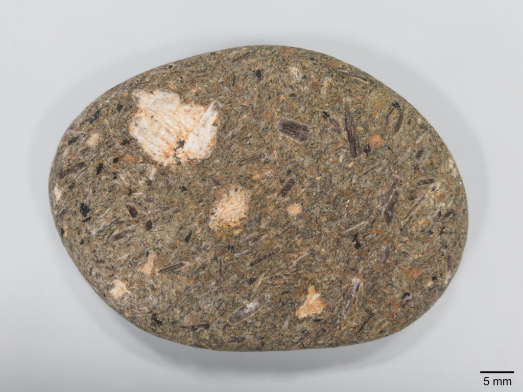 Der Foyait oder „trachytische“ Nephelinsyenit fällt durch sein besonderes Gefüge in Auge: weiße und schmal leistenförmige Alkalifeldspäte von 10-15 mm Länge bilden ein netzartiges Gerüst und weisen je nach Blickrichtung eine regellose Anordnung oder annähernd parallele Ausrichtung („trachytisches“ Gefüge) auf. Einige der idiomorphen Feldspäte bilden Karlsbader Zwillinge, gelegentlich kommen plattige Feldspäte vor. Der Nephelin-Anteil des Gesteins beträgt 10-25%. Das graue bis graubraune Mineral sitzt in den Zwischenräumen der Feldspäte in Gestalt xenomorpher bis eckiger Körner. Auf der Außenseite von Geschieben kann Nephelin ausgewittert sein und eine löchrige Oberfläche sowie ein skelettartiges Gewirr aus Feldspatleisten hinterlassen (Abb. 5). Als dunkle Minerale treten Biotit, nadeliger Ägirin und/oder Hornblende hinzu, als Nebenbestandteile Titanit (braune Aggregate bis 5 mm), gelegentlich grüner Apatit sowie etwas Erz. Quarz fehlt.