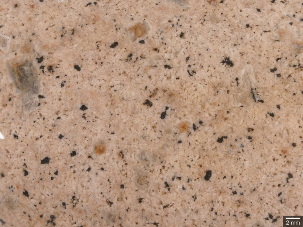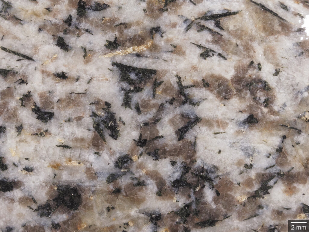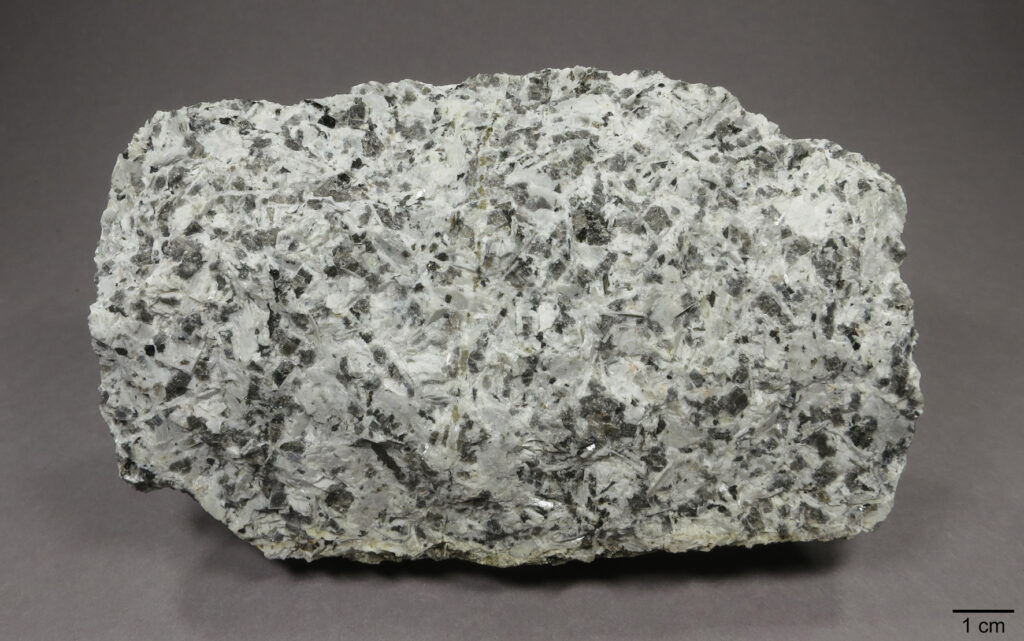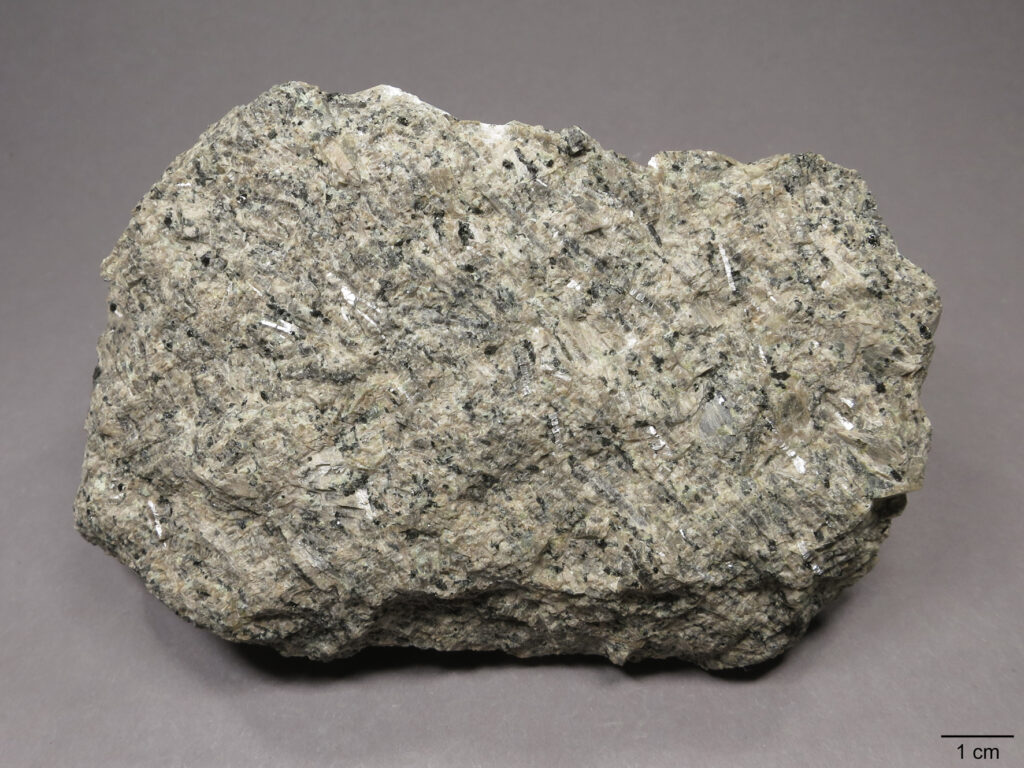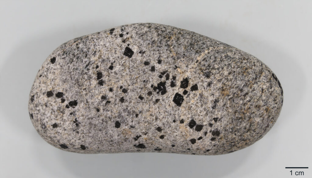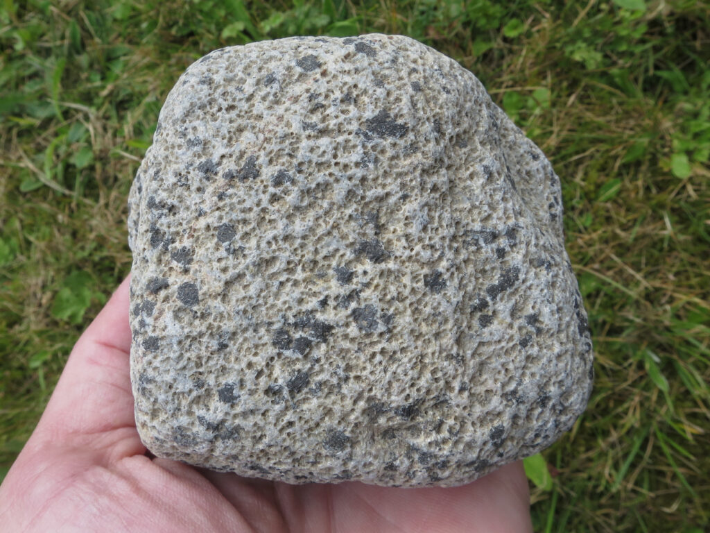 Der Foyait oder „trachytische“ Nephelinsyenit fällt durch sein besonderes Gefüge in Auge: weiße und schmal leistenförmige Alkalifeldspäte von 10-15 mm Länge bilden ein netzartiges Gerüst und weisen je nach Blickrichtung eine regellose Anordnung oder annähernd parallele Ausrichtung („trachytisches“ Gefüge) auf. Einige der idiomorphen Feldspäte bilden Karlsbader Zwillinge, gelegentlich kommen plattige Feldspäte vor. Der Nephelin-Anteil des Gesteins beträgt 10-25%. Das graue bis graubraune Mineral sitzt in den Zwischenräumen der Feldspäte in Gestalt xenomorpher bis eckiger Körner. Auf der Außenseite von Geschieben kann Nephelin ausgewittert sein und eine löchrige Oberfläche sowie ein skelettartiges Gewirr aus Feldspatleisten hinterlassen (Abb. 5). Als dunkle Minerale treten Biotit, nadeliger Ägirin und/oder Hornblende hinzu, als Nebenbestandteile Titanit (braune Aggregate bis 5 mm), gelegentlich grüner Apatit sowie etwas Erz. Quarz fehlt.