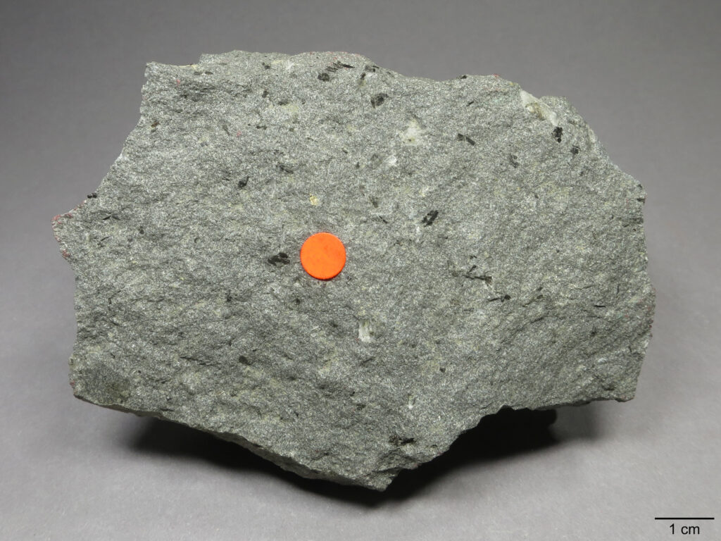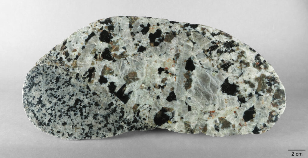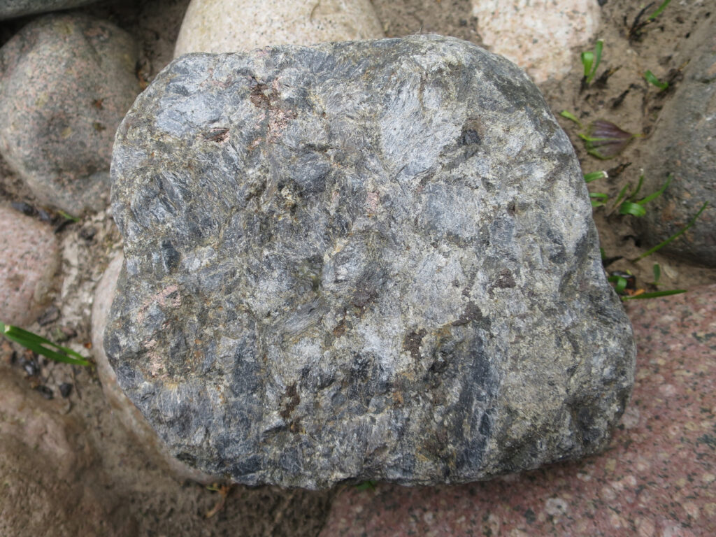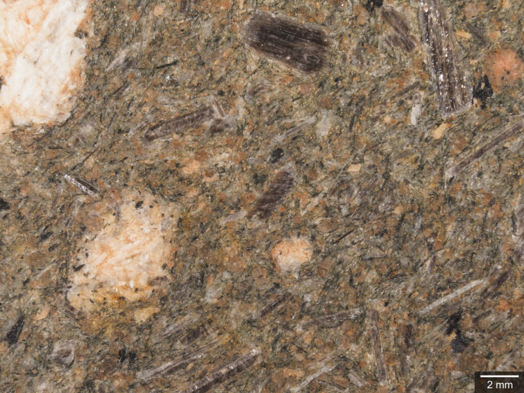 Der folgende Geschiebefund aus Dänemark könnte in die Reihe Nephelinsyenit – Hedrumit passen. Das graugrüne Gestein besitzt ein porphyrisches Gefüge und enthält größere graue, zum Rand hin etwas hellere Alkalifeldspat-Leisten. Sie zeigen eine annähernd parallele Ausrichtung, viele davon sind Karlsbader Zwillinge. In der feinkörnigen grünlichen Grundmasse deuten zahlreiche kleine, rötlichbraune und xenomorphe Körner auf alterierte Foide (Nephelin?). Weiterhin sind nadelige Pyroxene (Ägirin), stengelige dunkle Minerale und Glimmer erkennbar. Die größeren weißen bis blass orangefarbenen Aggregate (Xenolithe) bestehen teilweise aus Zusammenballungen leistenförmiger Alkalifeldspäte.