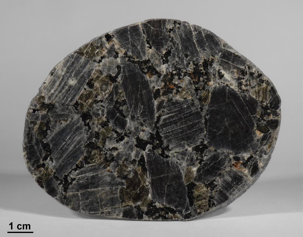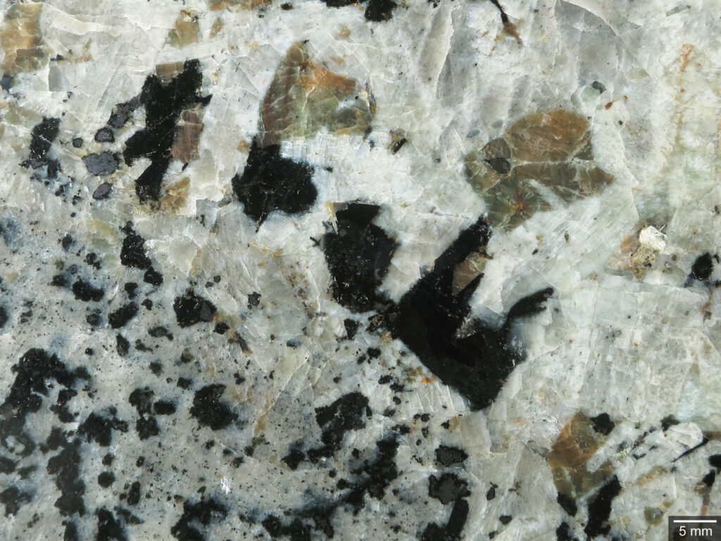 Abb. 8, 9: Foyait mit grauem Nephelin, Anstehendprobe von Farrisveien (NOR), 200 m W Lågendalsveien (N59.174873, E9.984337), leg. M. Bräunlich 2012; Slg. der BGR in Berlin-Spandau. Die Detailaufnahme (Abb. 9) zeigt einige halbseitig reflektierende Alkalifeldspäte (Karlsbader Zwillinge).