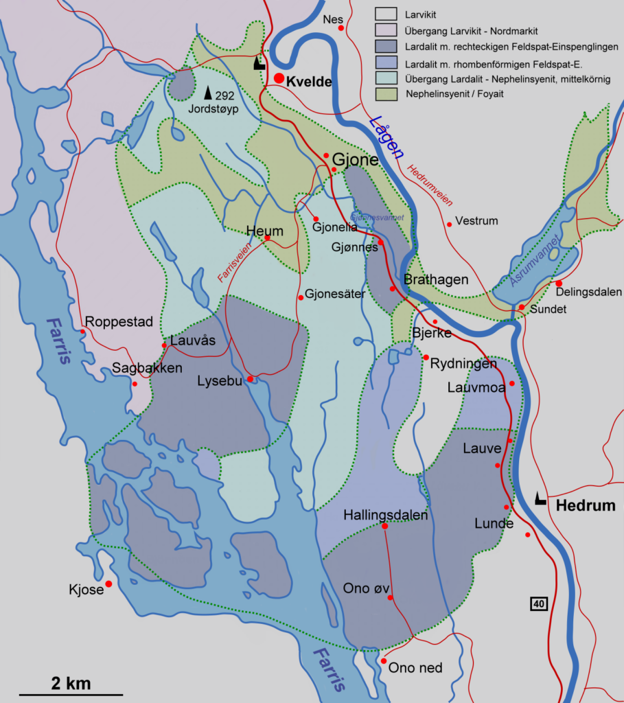 Die Nephelinsyenite des Oslograbens gingen als späte Differentiate und letzte Glieder der Plutonite der Larvikit-Serie aus stark SiO2-untersättigten Magmen hervor. Zu den Nephelinsyeniten zählen der grob- bis riesenkörnige Lardalit, die eher mittelkörnigen Nephelinsyenite (u. a. der Foyait) sowie Pegmatite. Innerhalb dieser Folge treten Ganggesteine auf, z. B. die Hedrumite. Alle Gesteine werden von BRØGGER 1898 ausführlich, teilweise erstmalig beschrieben. Die geologische Karte Abb. 1 zeigt die enge Vergesellschaftung von Larvikit, Lardalit und Nephelinsyeniten im Gelände.