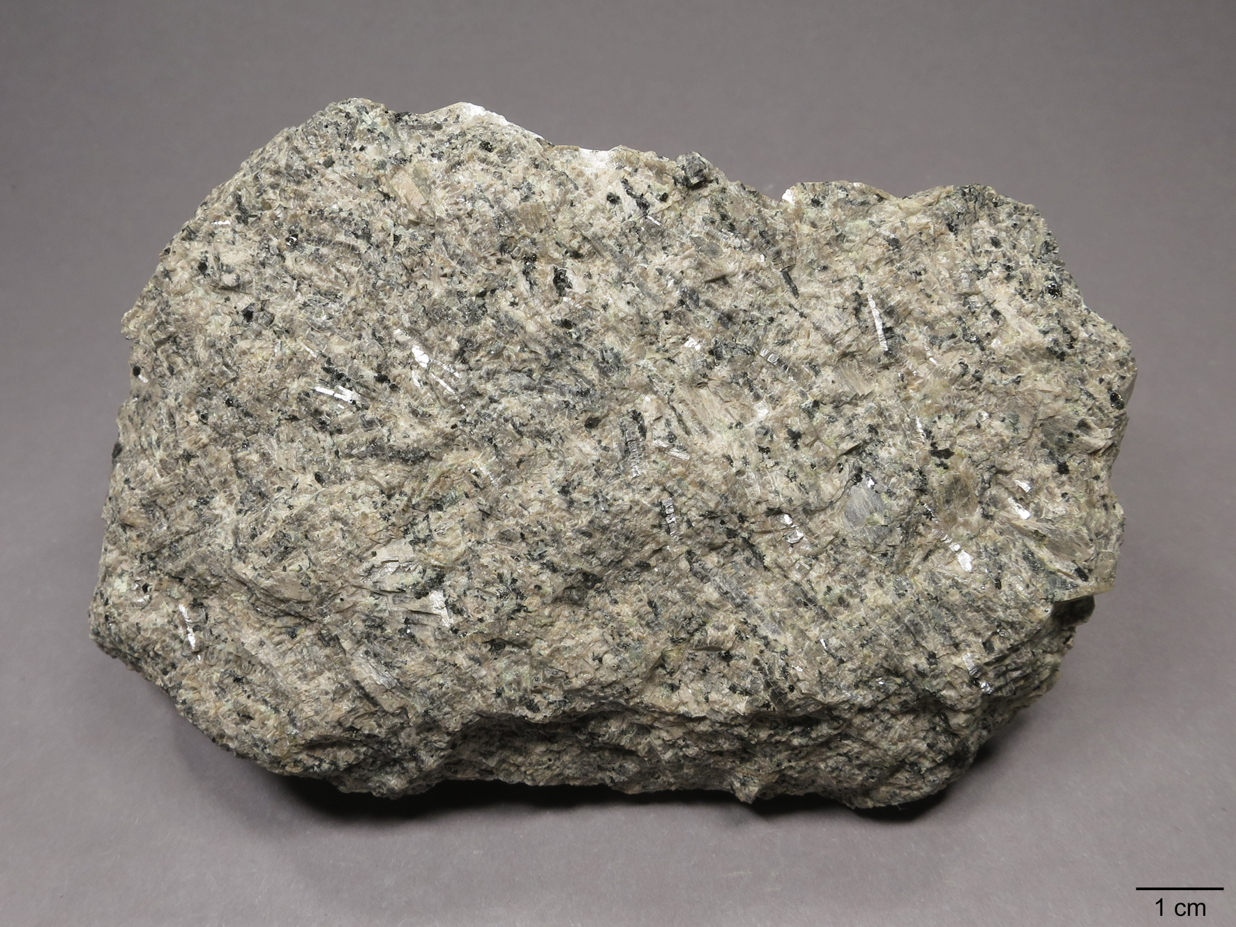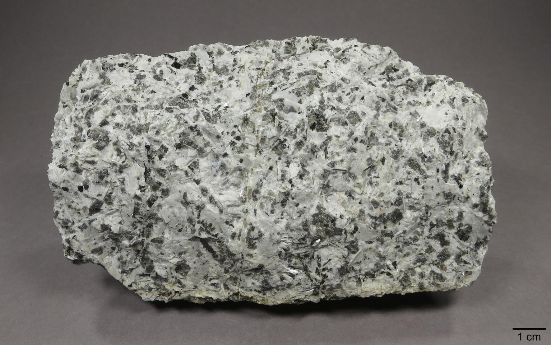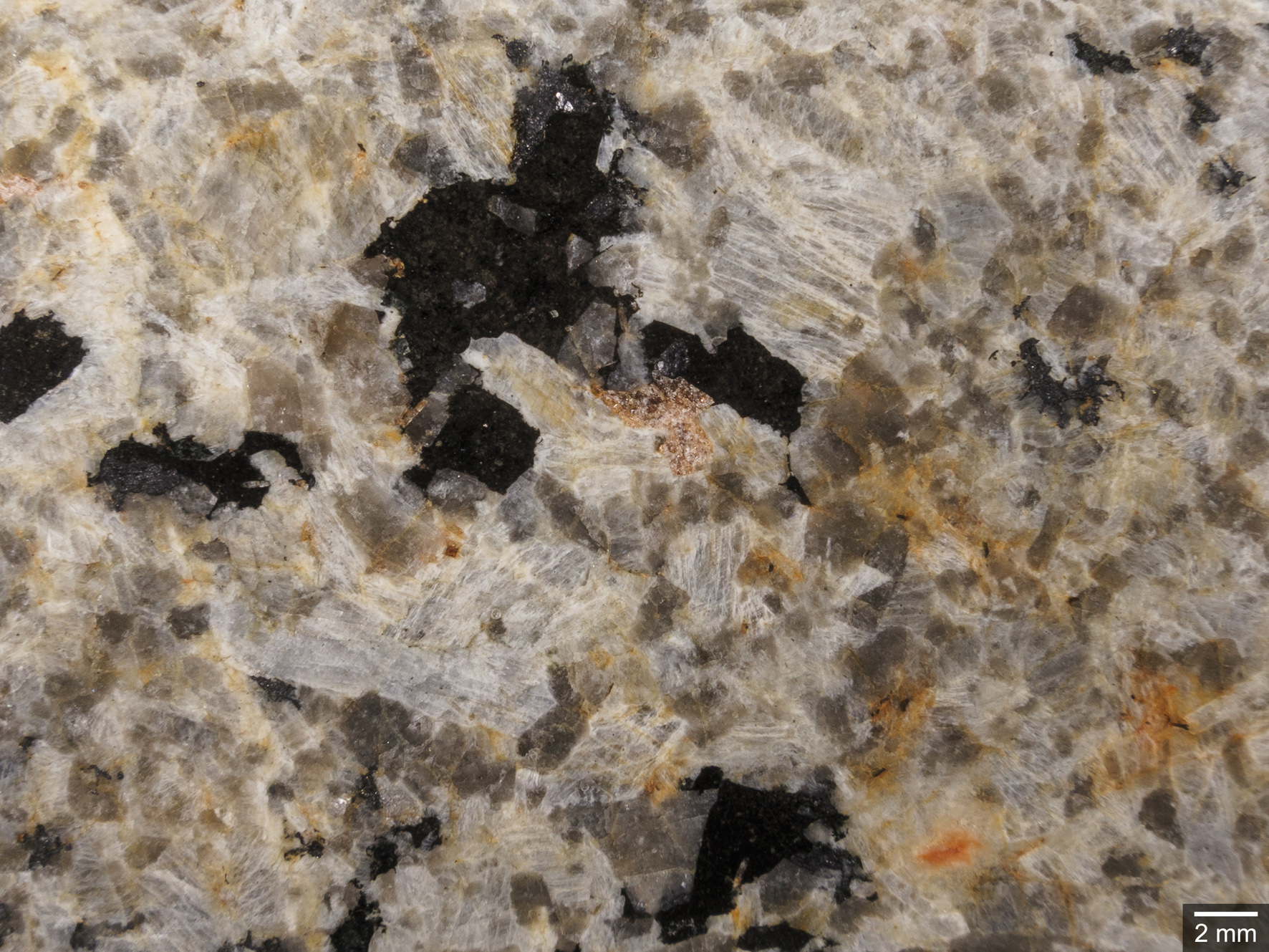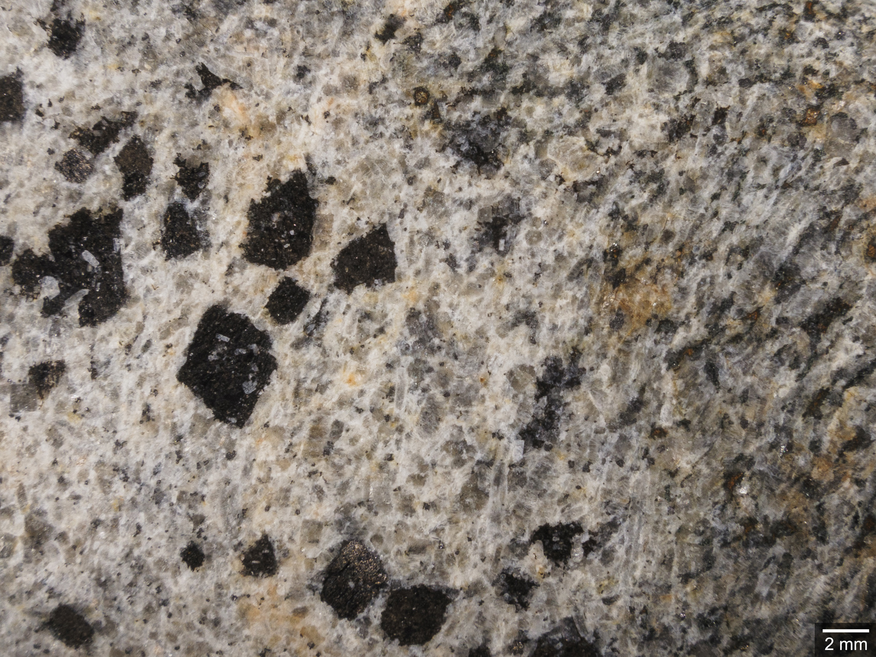Abb. 8, 9: Foyait mit grauem Nephelin, Anstehendprobe von Farrisveien (NOR), 200 m W Lågendalsveien (N59.174873, E9.984337), leg. M. Bräunlich 2012; Slg. der BGR in Berlin-Spandau. Die Detailaufnahme (Abb. 9) zeigt einige halbseitig reflektierende Alkalifeldspäte (Karlsbader Zwillinge).