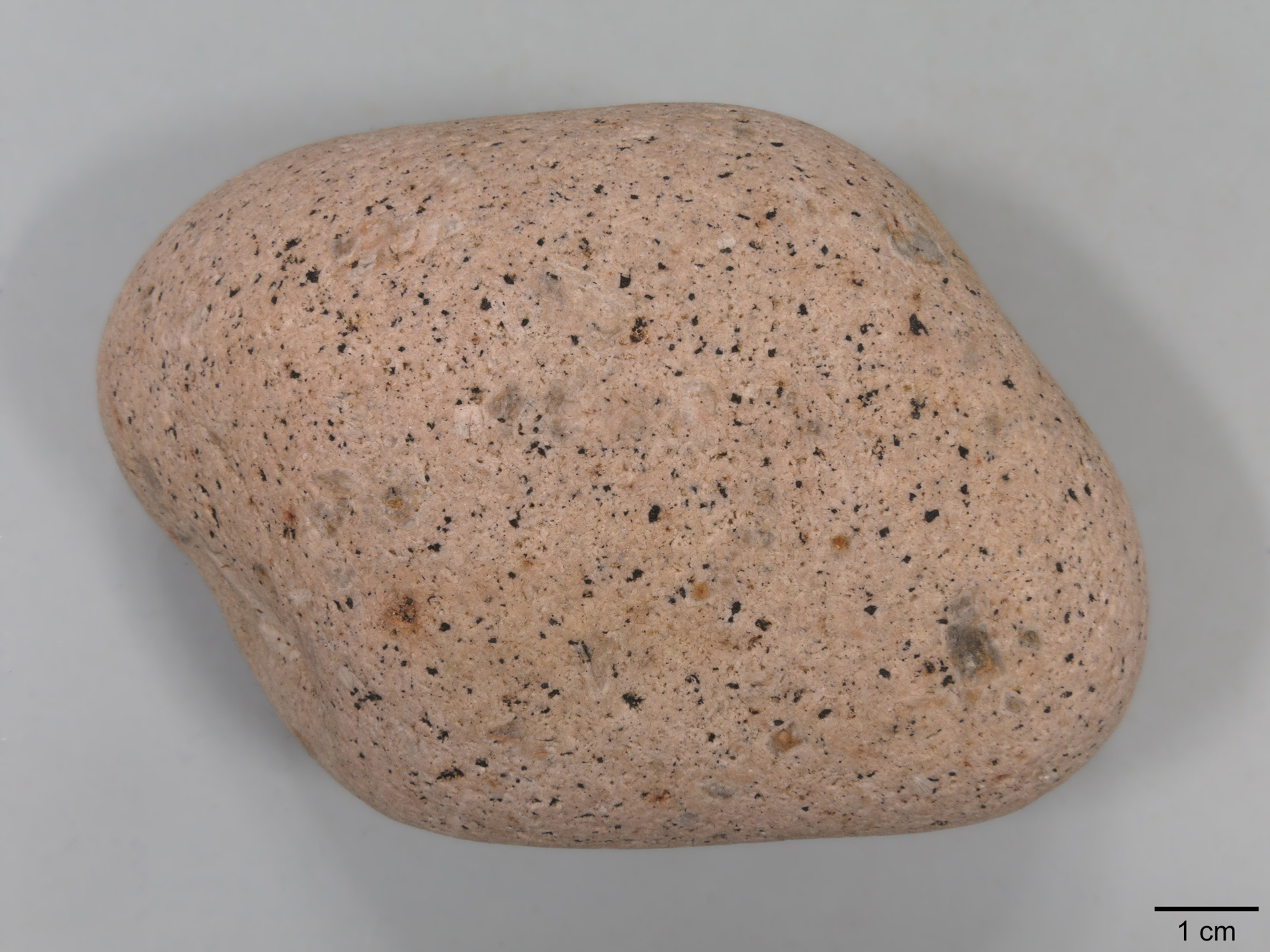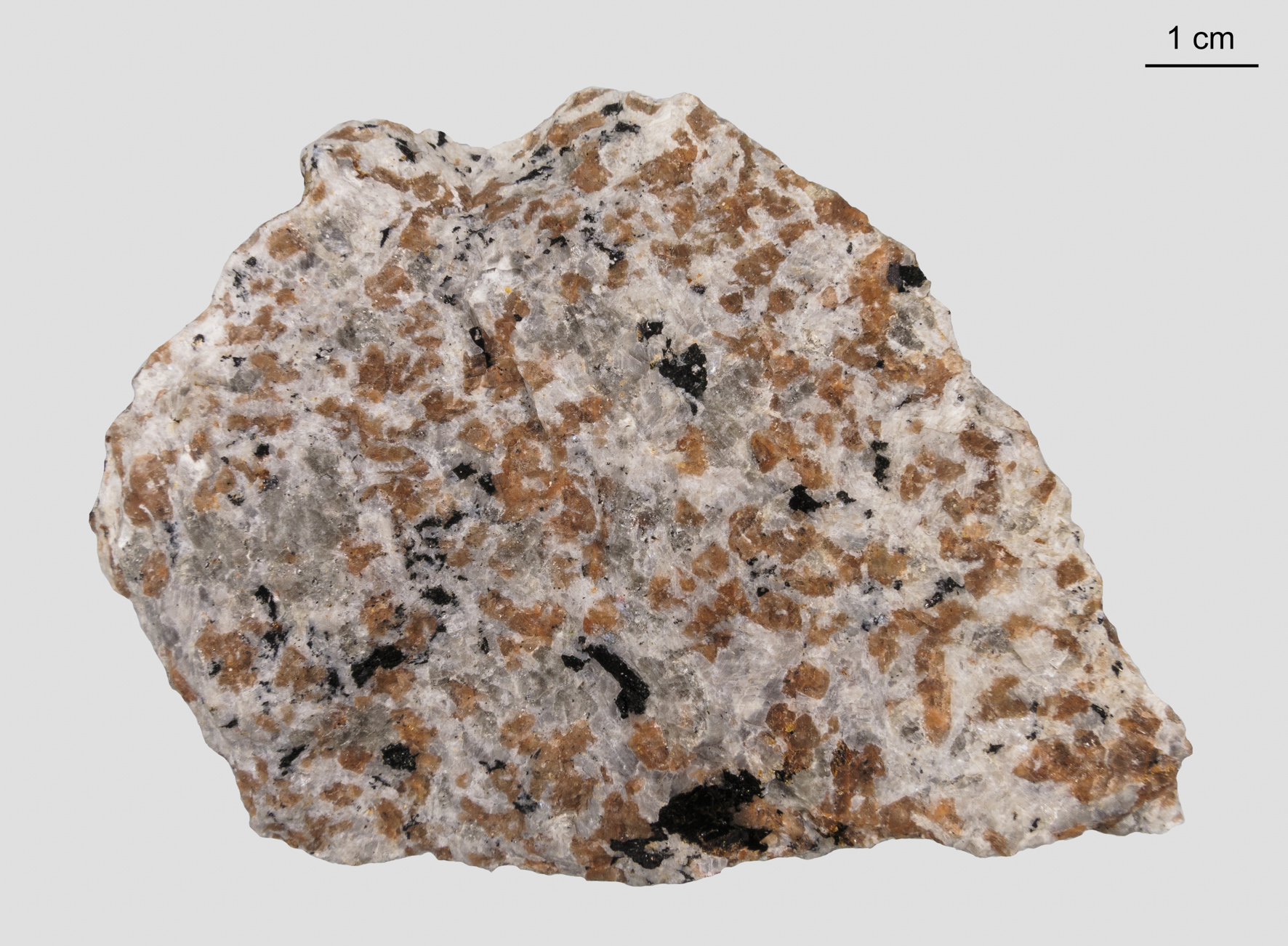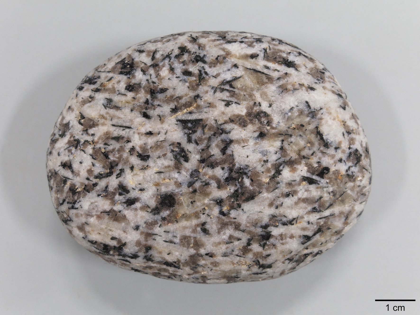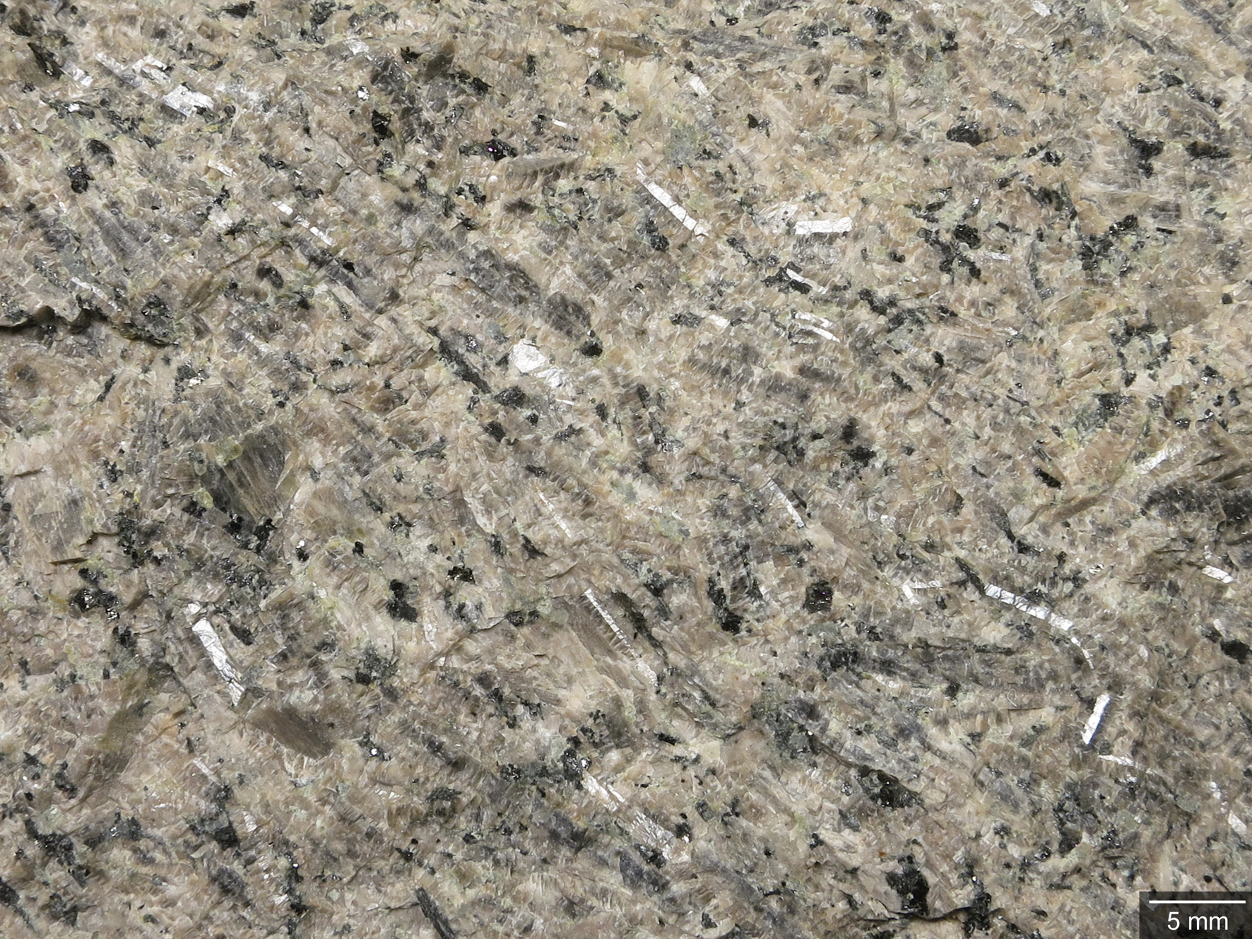 Der Foyait oder „trachytische“ Nephelinsyenit fällt durch sein besonderes Gefüge in Auge: weiße und schmal leistenförmige Alkalifeldspäte von 10-15 mm Länge bilden ein netzartiges Gerüst und weisen je nach Blickrichtung eine regellose Anordnung oder annähernd parallele Ausrichtung („trachytisches“ Gefüge) auf. Einige der idiomorphen Feldspäte bilden Karlsbader Zwillinge, gelegentlich kommen plattige Feldspäte vor. Der Nephelin-Anteil des Gesteins beträgt 10-25%. Das graue bis graubraune Mineral sitzt in den Zwischenräumen der Feldspäte in Gestalt xenomorpher bis eckiger Körner. Auf der Außenseite von Geschieben kann Nephelin ausgewittert sein und eine löchrige Oberfläche sowie ein skelettartiges Gewirr aus Feldspatleisten hinterlassen (Abb. 5). Als dunkle Minerale treten Biotit, nadeliger Ägirin und/oder Hornblende hinzu, als Nebenbestandteile Titanit (braune Aggregate bis 5 mm), gelegentlich grüner Apatit sowie etwas Erz. Quarz fehlt.