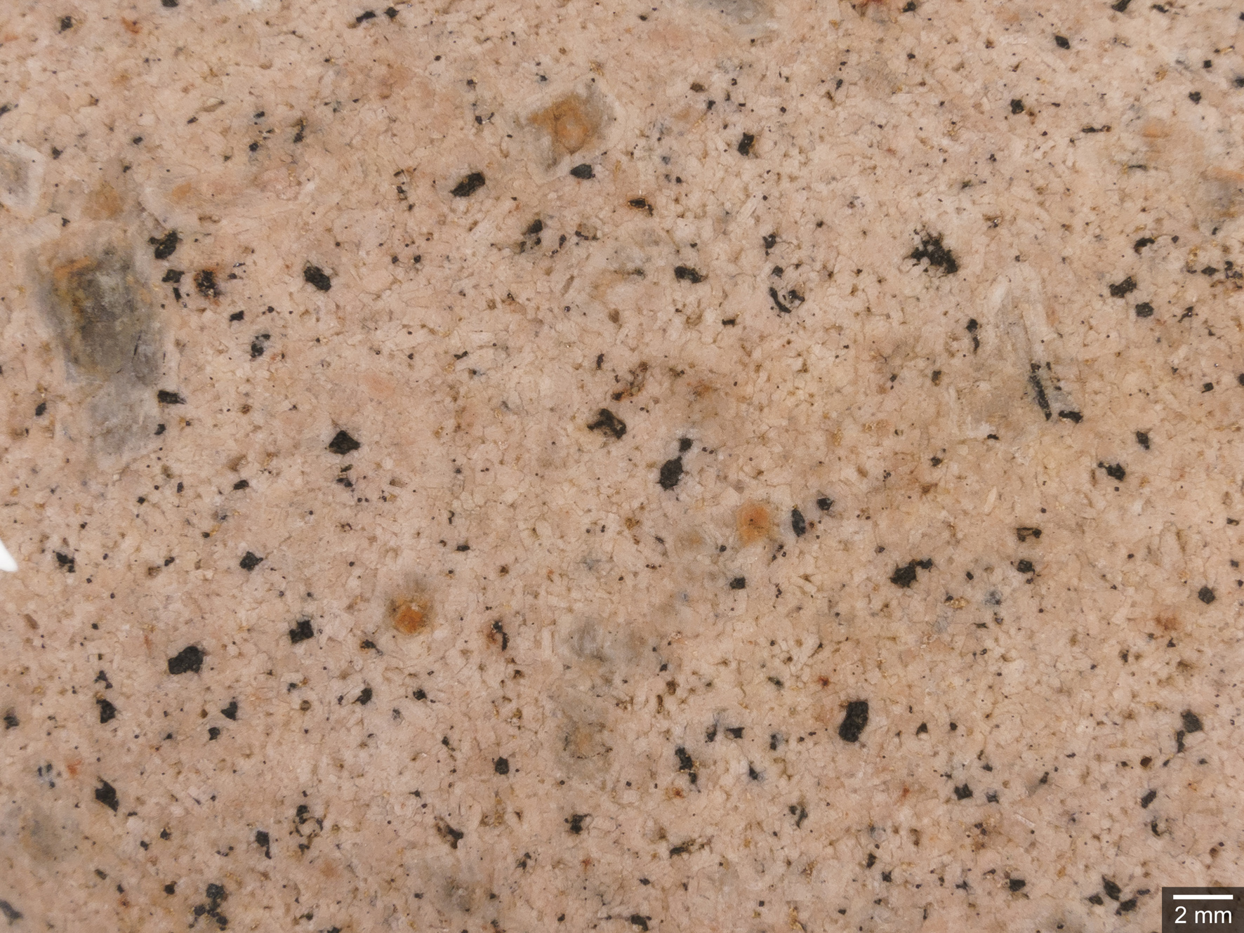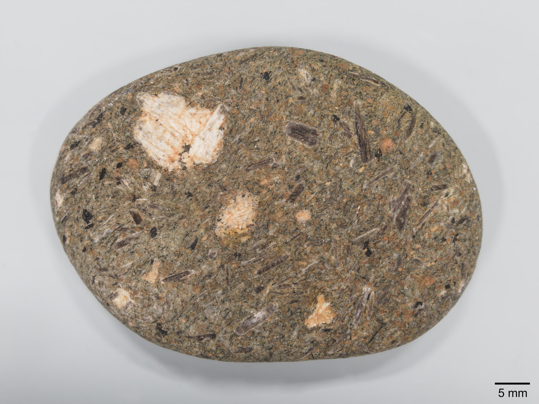 Der folgende Geschiebefund aus Dänemark könnte in die Reihe Nephelinsyenit – Hedrumit passen. Das graugrüne Gestein besitzt ein porphyrisches Gefüge und enthält größere graue, zum Rand hin etwas hellere Alkalifeldspat-Leisten. Sie zeigen eine annähernd parallele Ausrichtung, viele davon sind Karlsbader Zwillinge. In der feinkörnigen grünlichen Grundmasse deuten zahlreiche kleine, rötlichbraune und xenomorphe Körner auf alterierte Foide (Nephelin?). Weiterhin sind nadelige Pyroxene (Ägirin), stengelige dunkle Minerale und Glimmer erkennbar. Die größeren weißen bis blass orangefarbenen Aggregate (Xenolithe) bestehen teilweise aus Zusammenballungen leistenförmiger Alkalifeldspäte.