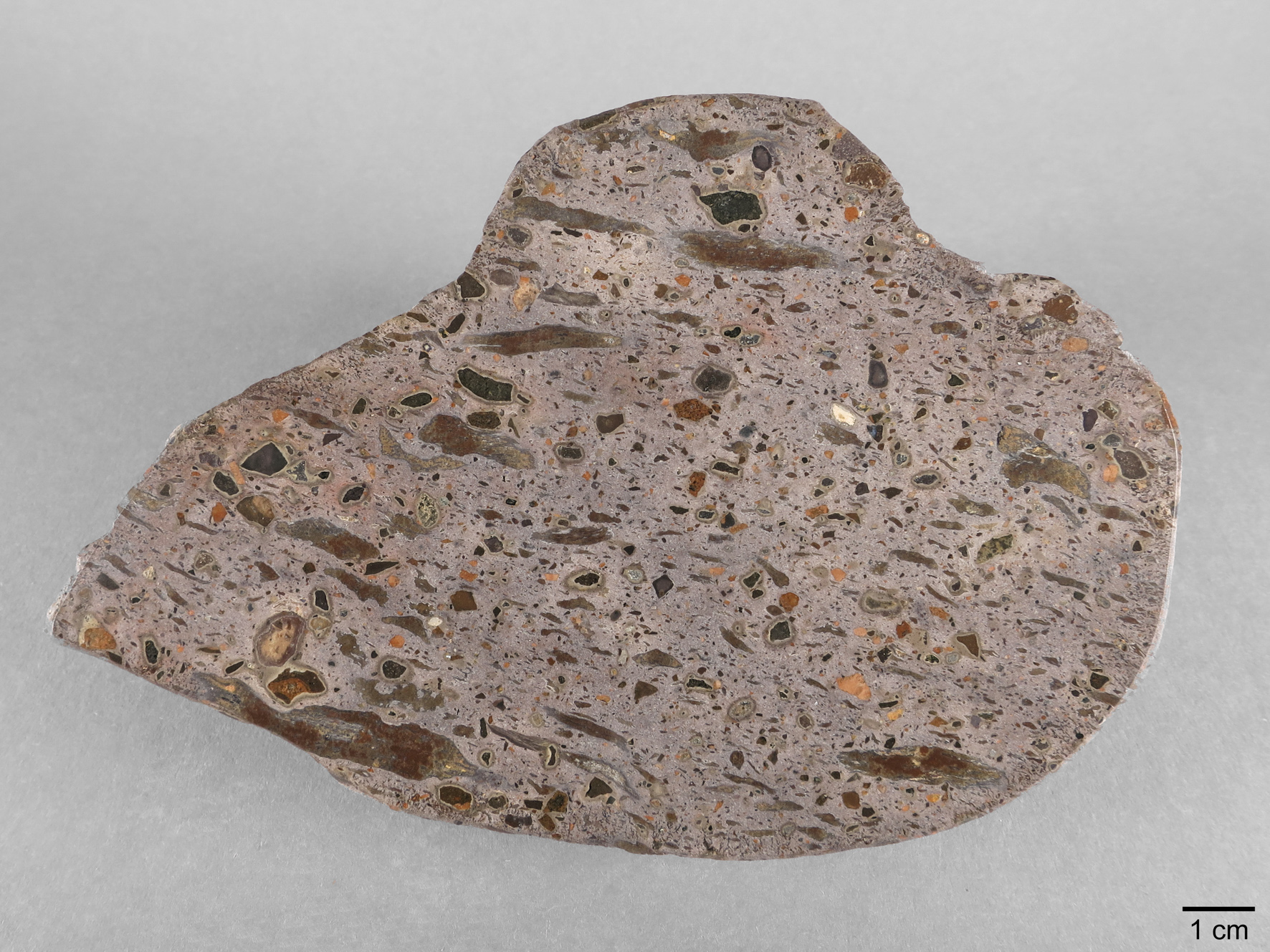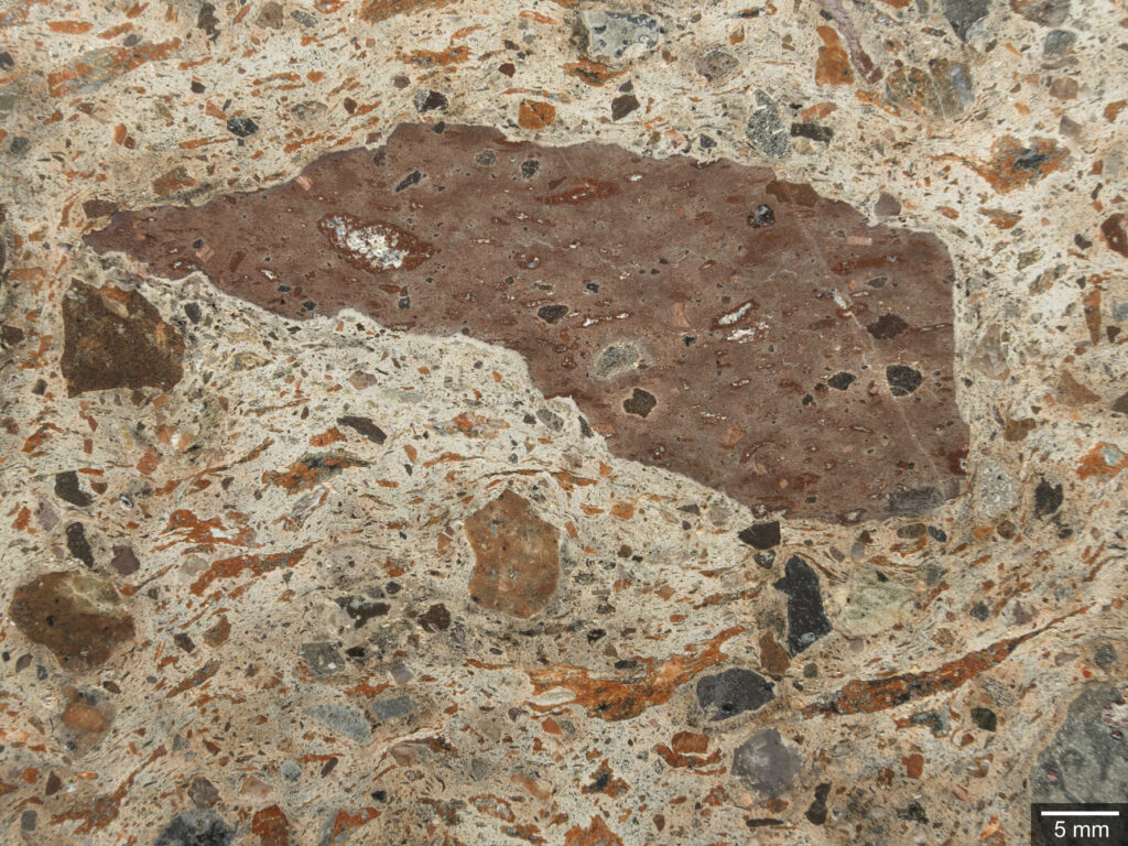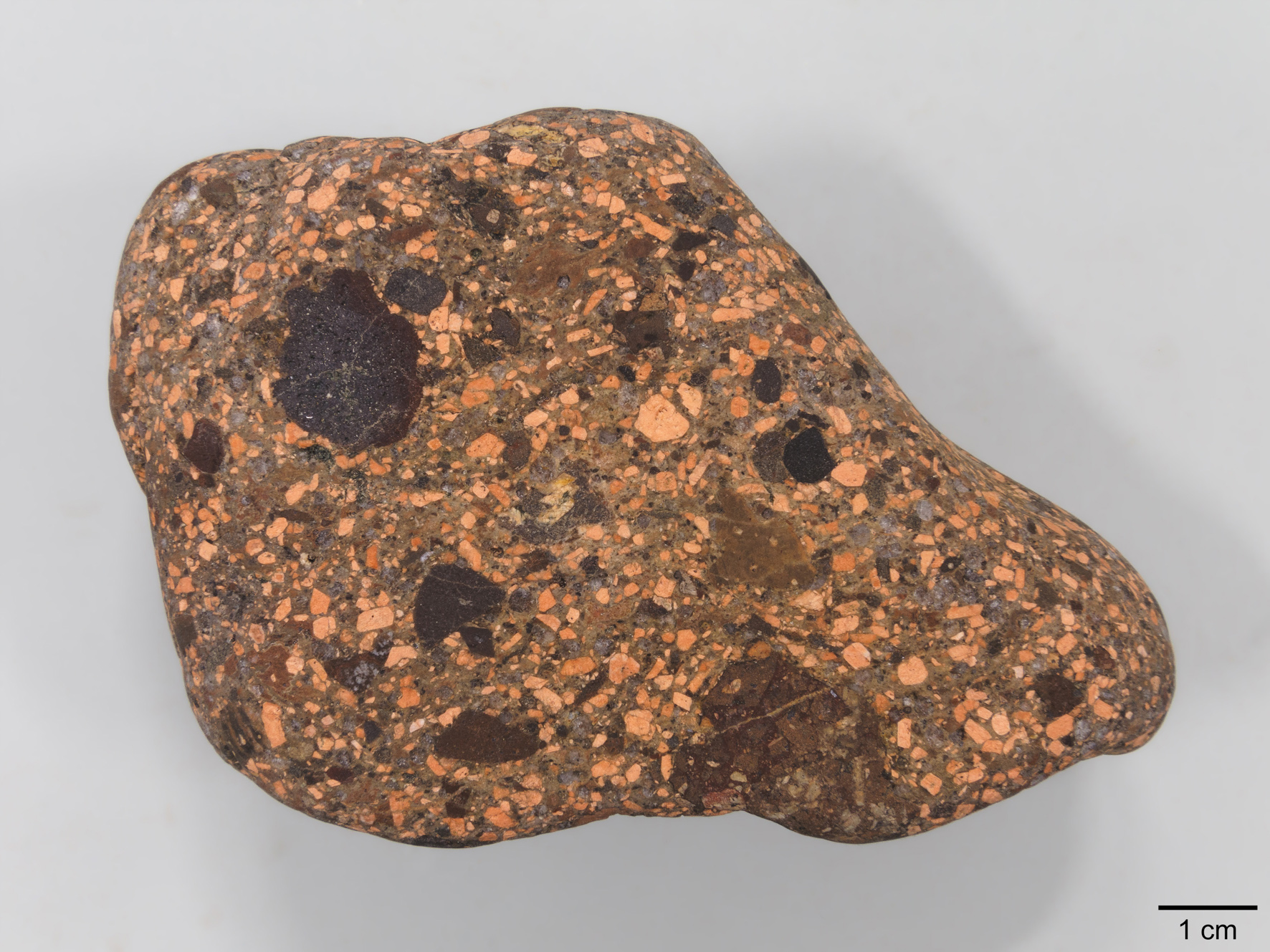 Abb. 34: vulkanische Brekzie mit Syenitporphyren, Quarzporphyren und „Felsitporphyren“, polierte Schnittfläche, Geschiebe von Moss (NOR), Slg. F. Wilcke.