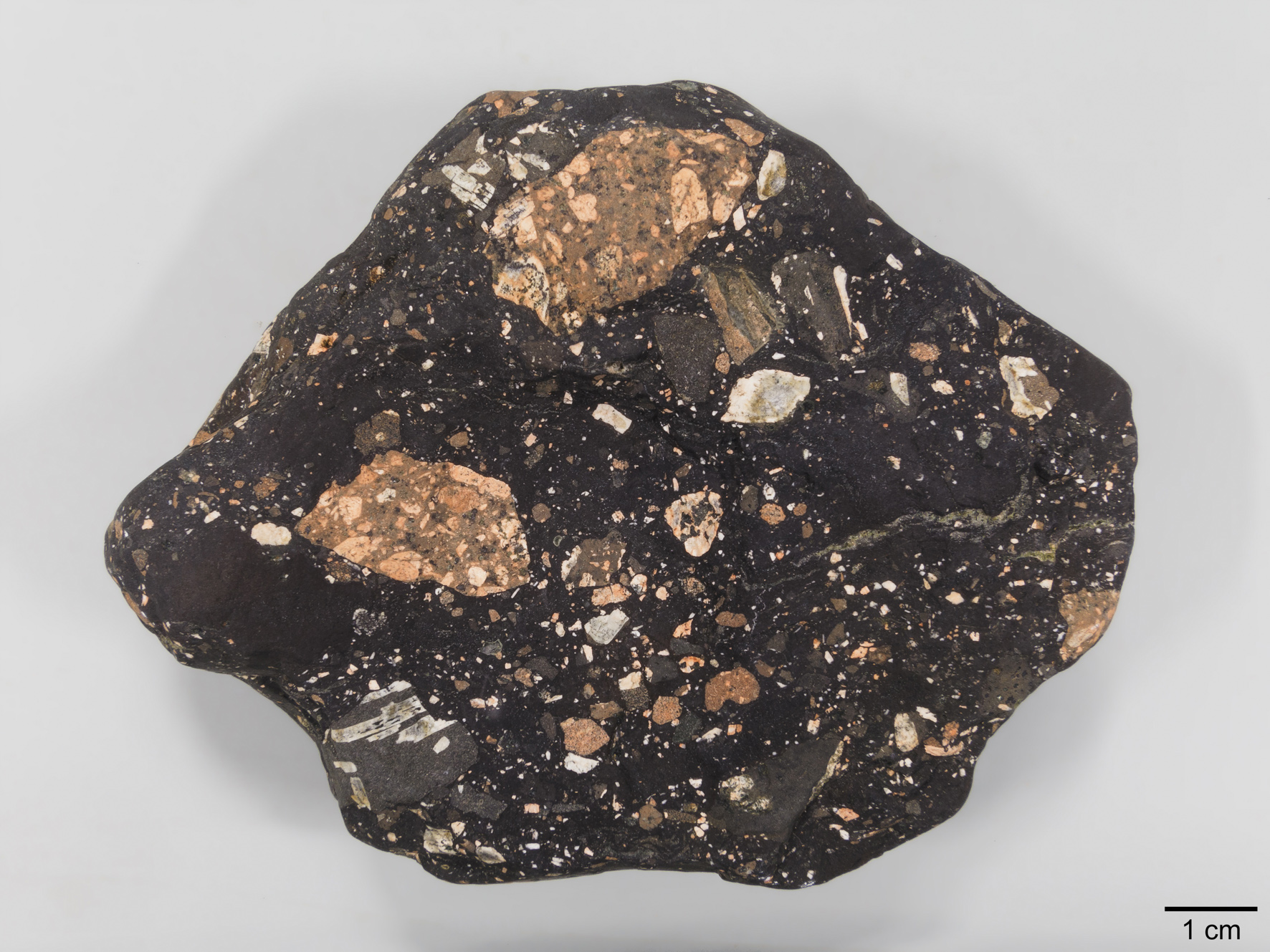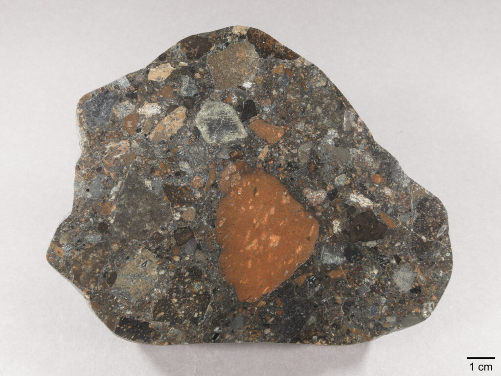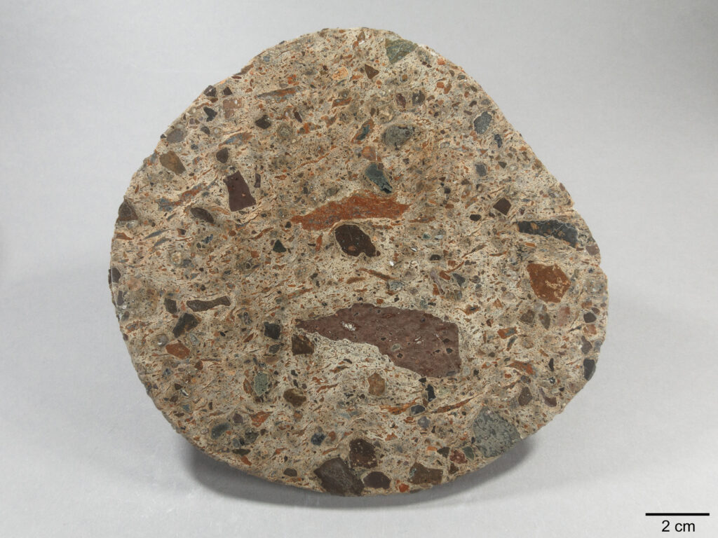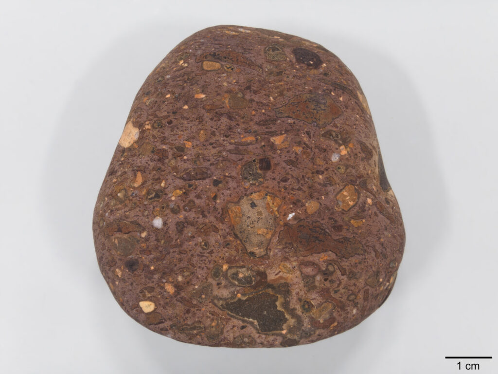 Abb. 34: vulkanische Brekzie mit Syenitporphyren, Quarzporphyren und „Felsitporphyren“, polierte Schnittfläche, Geschiebe von Moss (NOR), Slg. F. Wilcke.