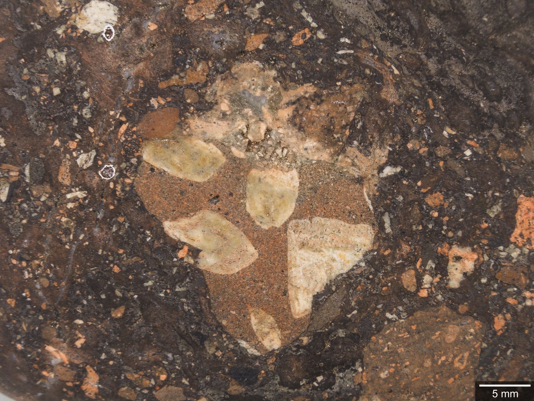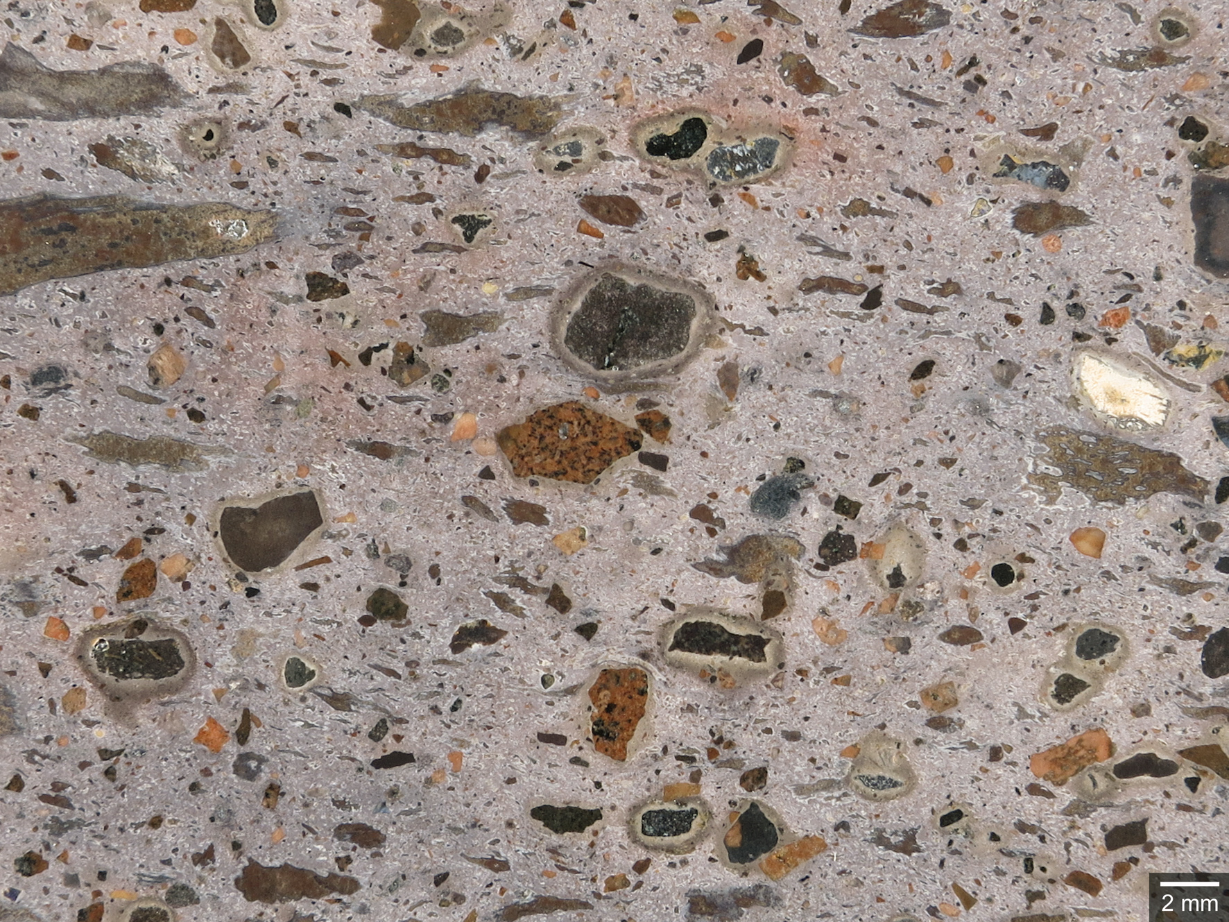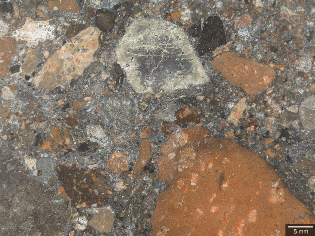 Abb. 19: Nahaufnahme; insbesondere die dunklen Gesteinsfragmenten weisen einen zonierten Saum auf.
