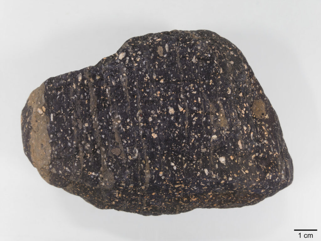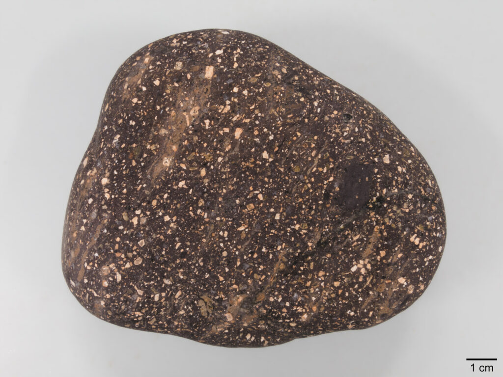 Abb. 9: Bordvika-Ignimbrit mit dunkelbrauner Grundmasse, Geschiebe von Hökholz bei Eckernförde, Breite 12 cm.