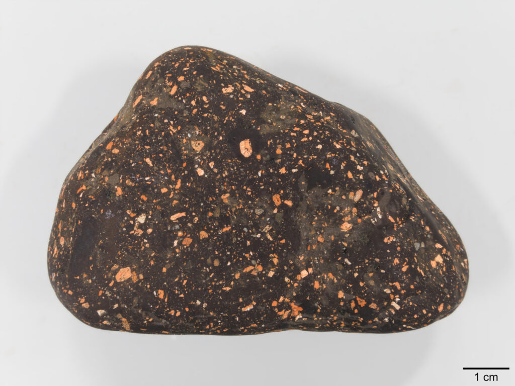 Abb. 16: dunkler Quarzporphyr („Bordvika-Ignimbrit“) mit leuchtend orangefarbenen Feldspat- und wenig Quarz-Einsprenglingen, Geschiebe von Ramsvik/Tofte (NOR), ex coll. H. Arildskov.