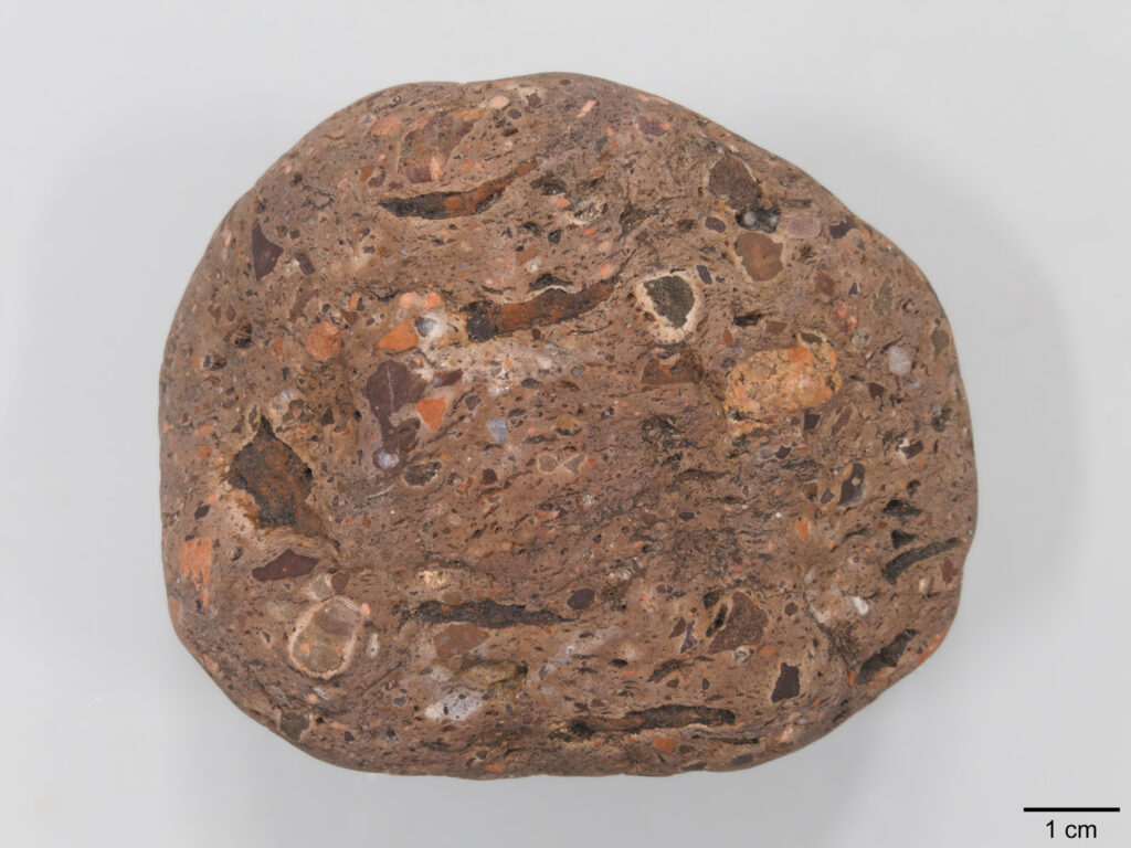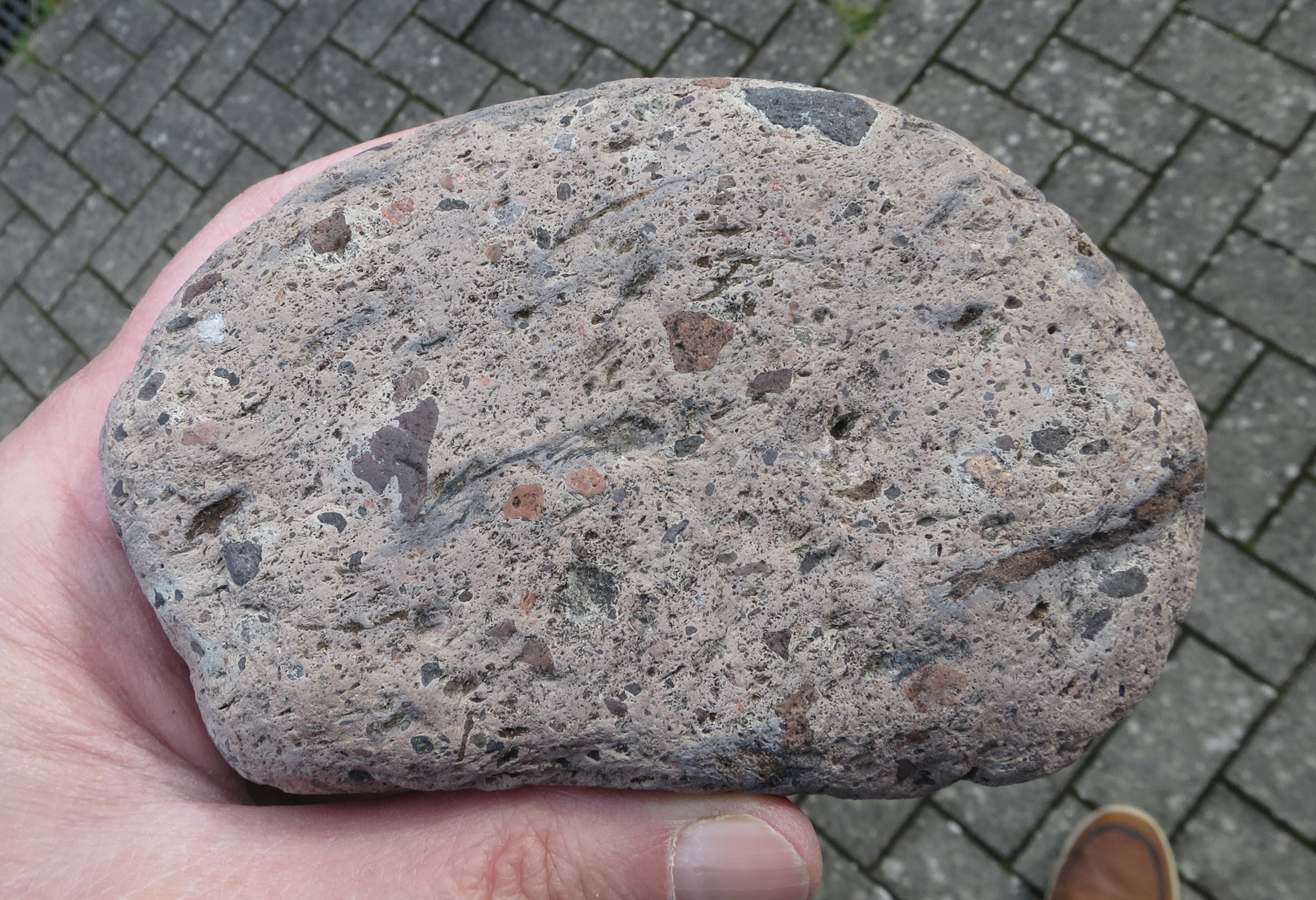 Abb. 32: vulkanische Brekzie (Lapillistein), teils kalzitzementiert, mit Rhombenporphyr-Fragment, Breite 13 cm, Hirtshals (DK).