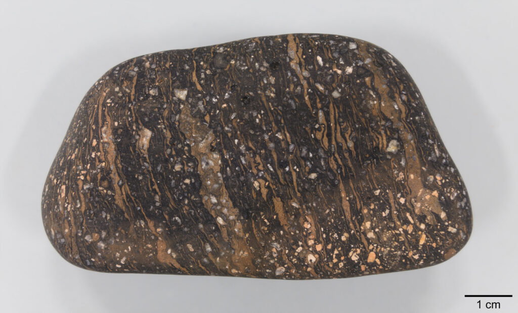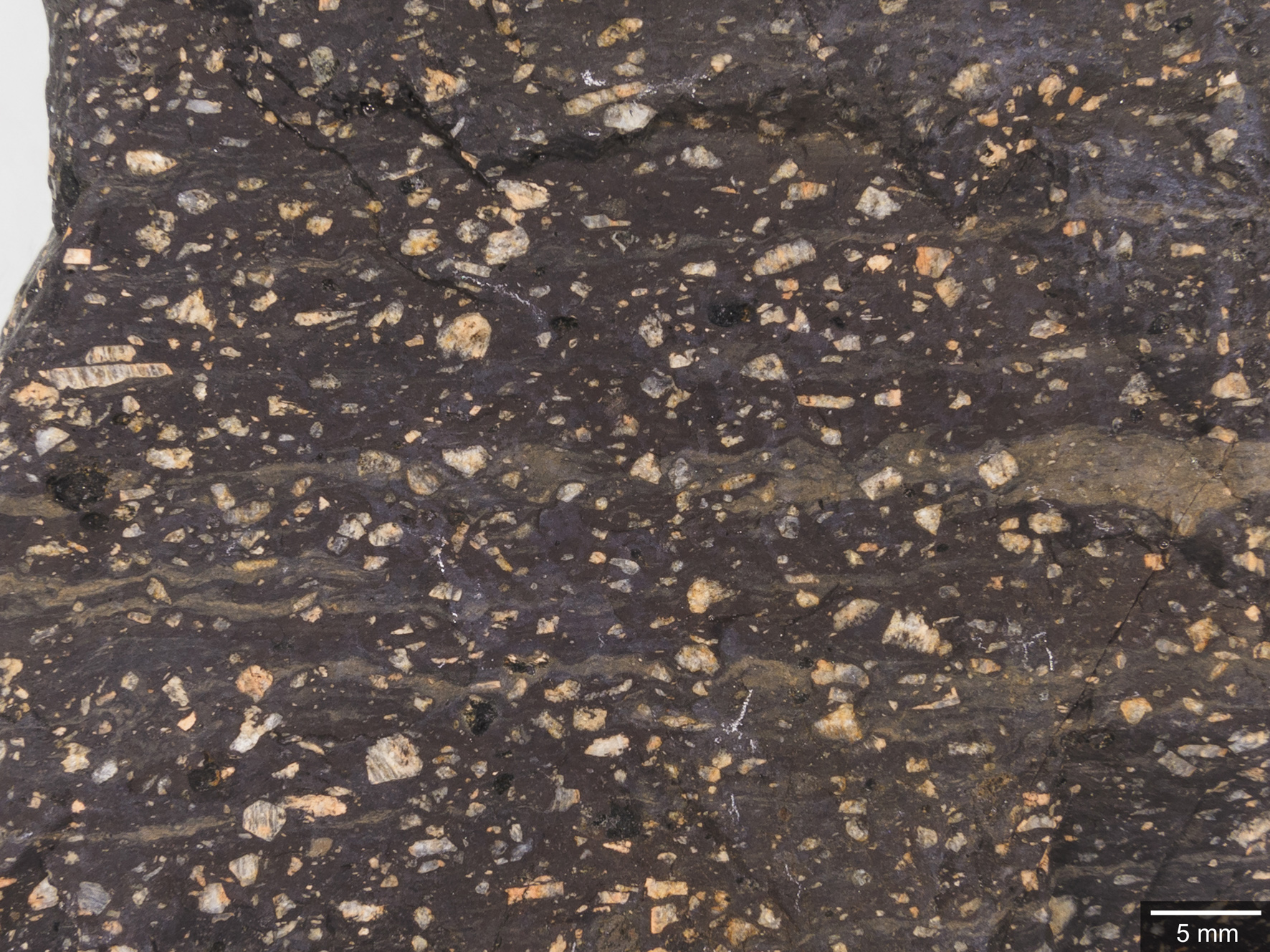 Abb. 2: Nahaufnahme der hellen Tuffmatrix mit Gesteinsfragmenten, einzelne davon umflossen von einer rötlichbraunen und welligen „Fiamme“, dem charakteristischen Erkennungsmerkmal von Ignimbriten.