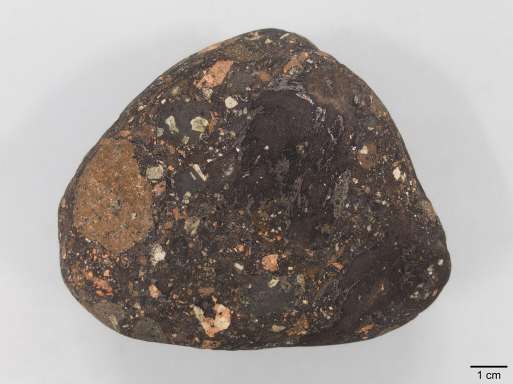 Abb. 23: Lathus-Ignimbrit mit Bruchstücken von bräunlichem Syenitporphyr, Breite 13 cm, Nahgeschiebe von Steinvik/Hurum (NOR), ex coll. H. Arildskov.