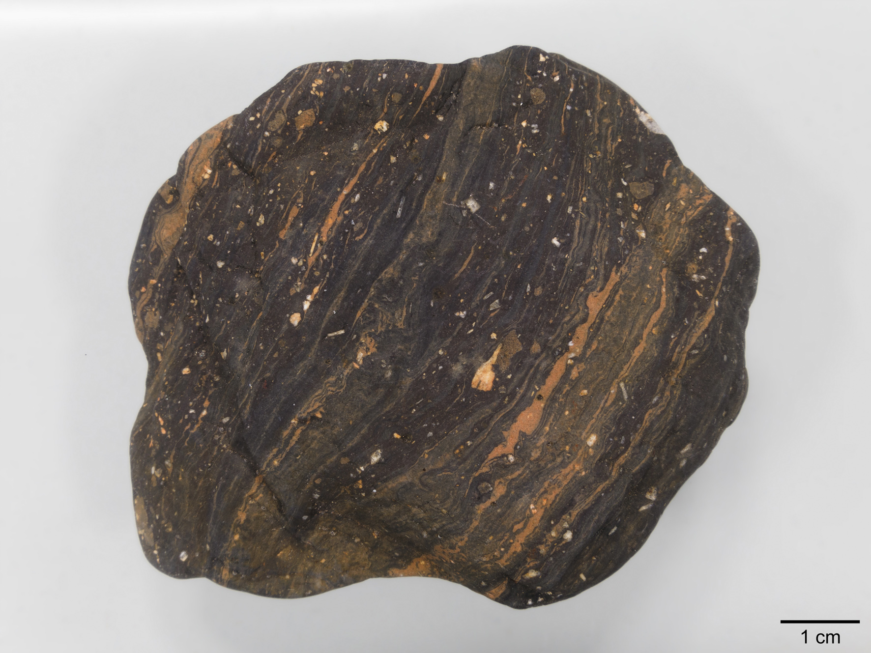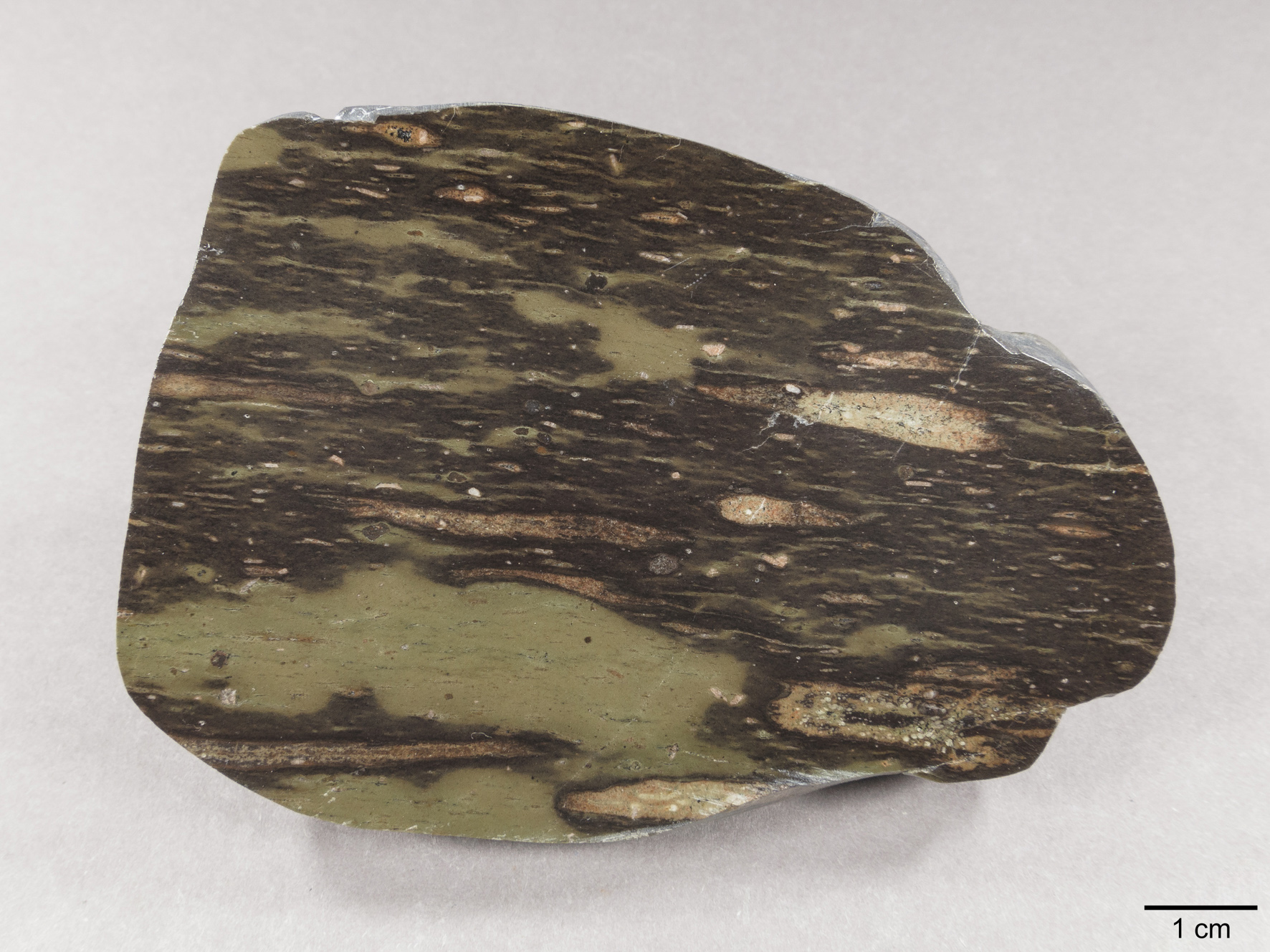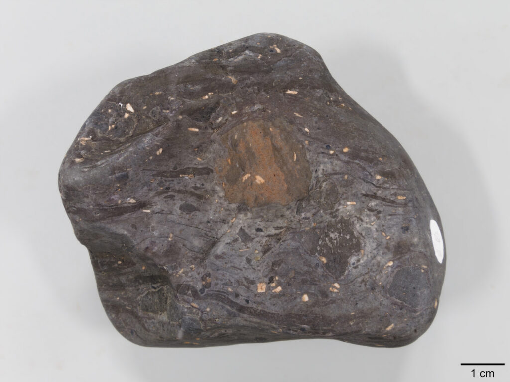 Abb. 1: Oslo-Ignimbrit, Geschiebe von Mølen, SW von Larvik (NOR), polierte Schnittfläche, Slg. T. Brückner.