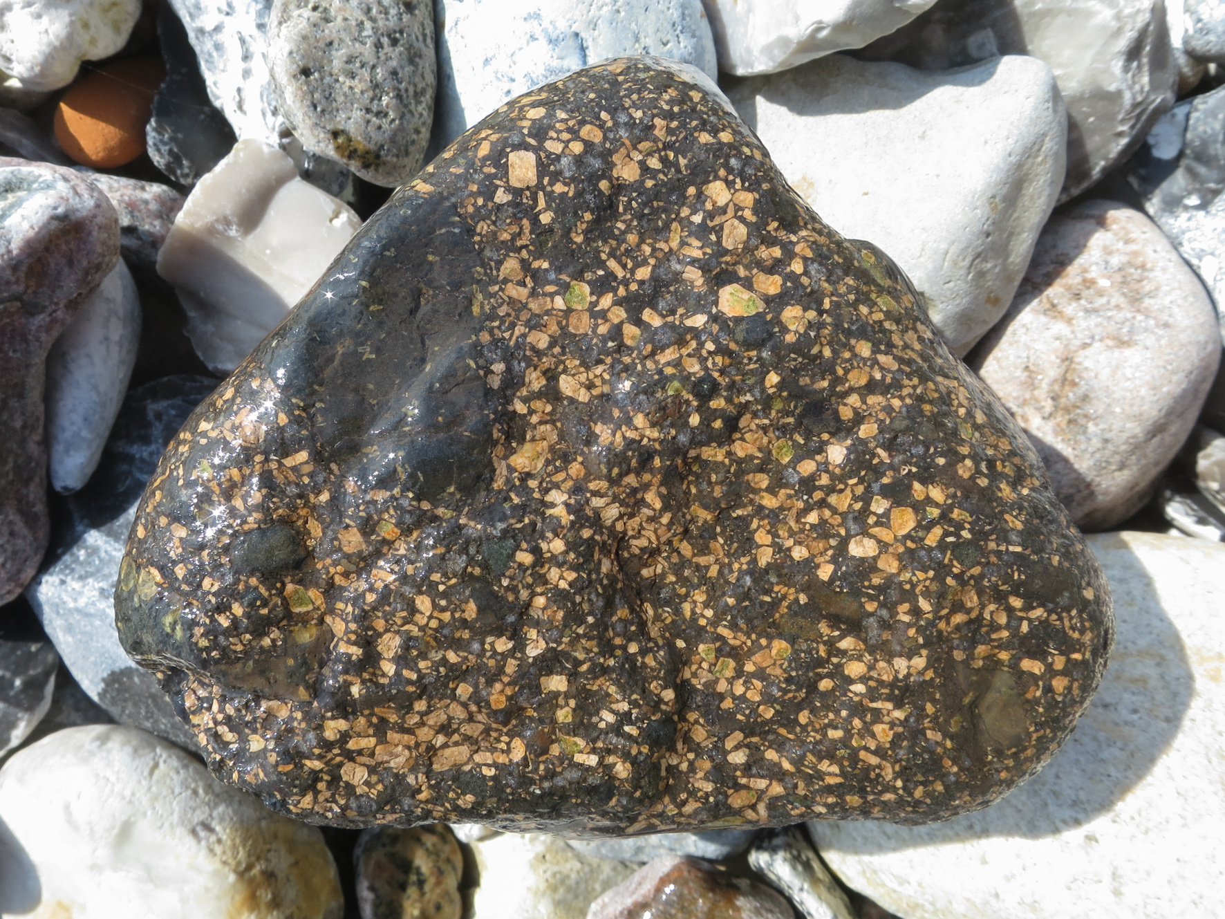 Abb. 33: dunkelgraue und dichte vulkanische Brekzie mit gelblichen Feldspat-Einsprenglingen und grünlichen Gesteinsfragmenten, Breite 11 cm, Hirtshals (DK).