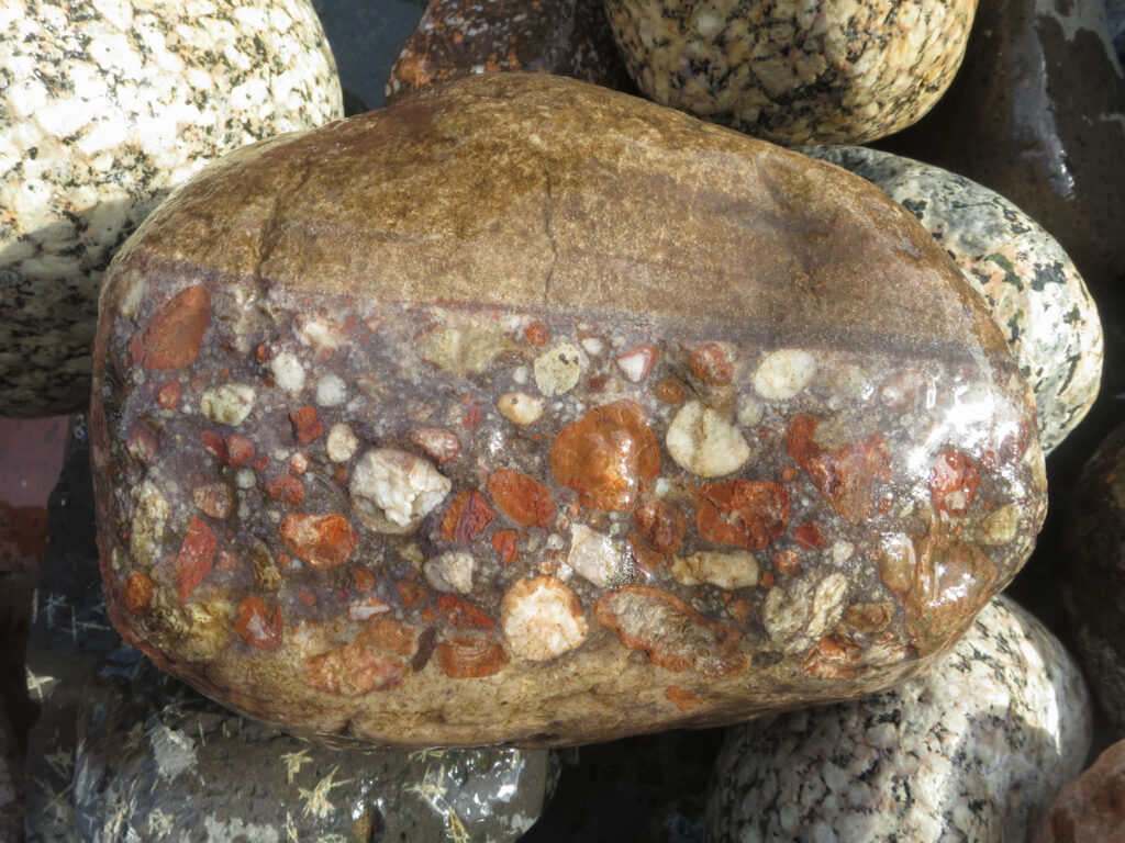 Dieses Achat-Konglomerat sieht anders aus als das Geschiebe aus Abb. 5-7. Runde Milchquarz-Klasten und kantige bis mäßig gerundete Klasten von orangerotem Bandachat sowie massigem Jaspis liegen in einer feinkörnigen und mittelgrauen Sandstein-Matrix. Auf den Schichtflächen des Sandsteins sind zahlreiche glänzende Glimmerschüppchen erkennbar. Achatgehalt und Größe der Gerölle variieren in diesem Typ. Die Matrix kann auch einen hellgelblichen oder grünen Farbton besitzen, vgl. Nahgeschiebe auf skan-kristallin.de.