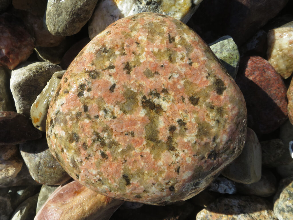 Das letzte Großgeschiebe zeigt einige Merkmale des Vänge-Granits (hellroter Alkalifeldspat, grünliche Massen aus zerdrücktem Quarz, größere trübe Quarzkörner). Durch den hohen Gehalt an Plagioklas ist das Gestein aber kein Granit, sondern ein Granodiorit. Die Art des Gefüges der kleinen Plagioklaskörner erinnert an andere Uppland-„Granite“, z. B. den Uppsala-Granit. Im Vänge-Massiv kommen auch Plutonite mit intermediärer Zusammensetzung vor (Lundegardh 1956: 55). Ob das Geschiebe tatsächlich von dort stammt, lässt sich allerdings nicht mit Sicherheit feststellen.
